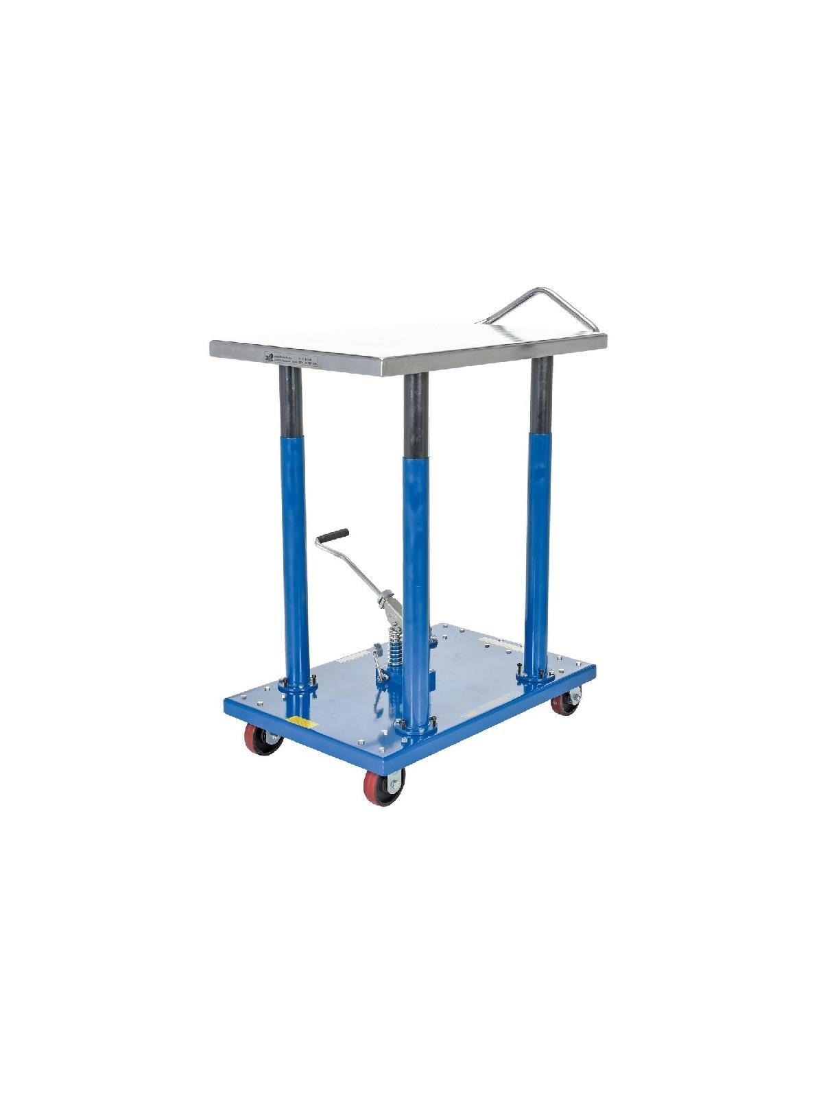 Hydraulic center post lifts tabletop with rigidity. Models with corner posts are telescoping to help stabilize and fully support the load during operation. Rolls smoothly on durable heavy duty casters. FOB Shipping Point.