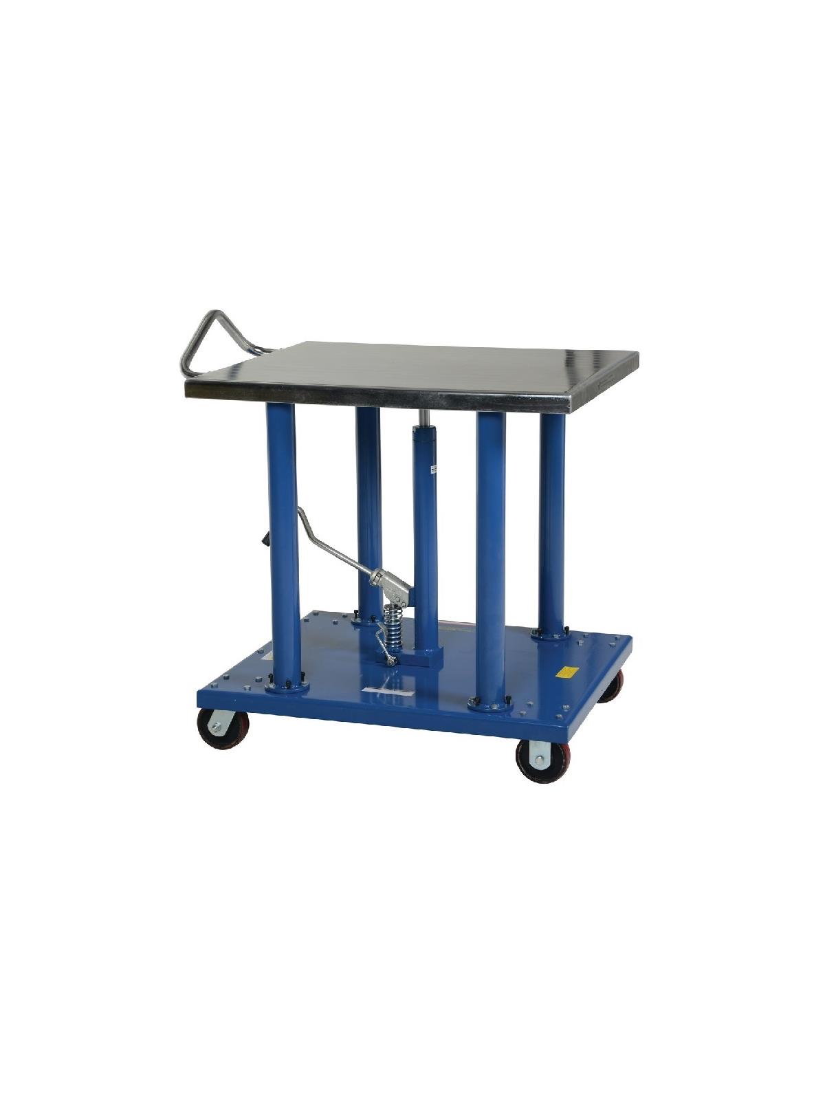 Hydraulic center post lifts tabletop with rigidity. Models with corner posts are telescoping to help stabilize and fully support the load during operation. Rolls smoothly on durable heavy duty casters. FOB Shipping Point.