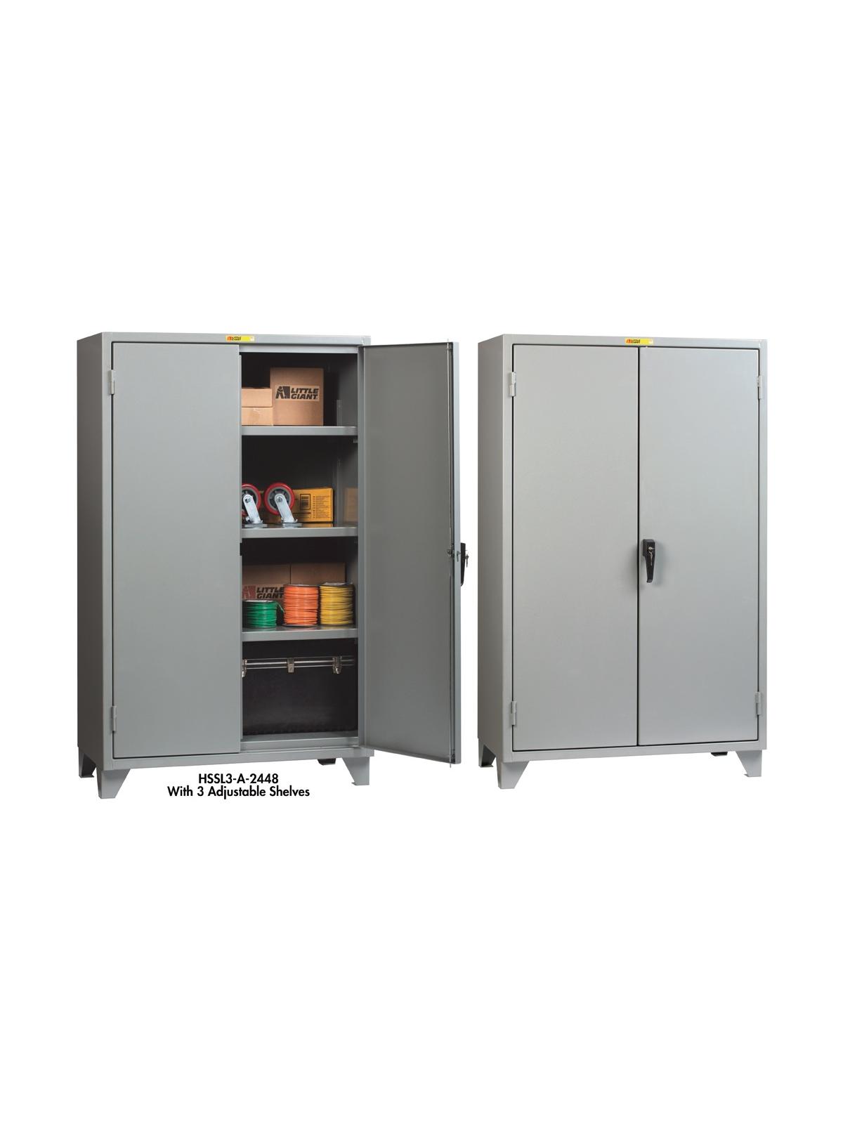 Rugged 12 gauge all welded cabinet is designed for long term use in the most demanding environments. Secure 3 point latching system with keyed handle secures the doors at the top, center and bottom. 14 gauge shelves are adjustable in 3-1/2" increments. Door swing is 180° allowing complete access to the interior. Durable powder coated gray finish. FOB Shipping Point. Surcharge may apply.