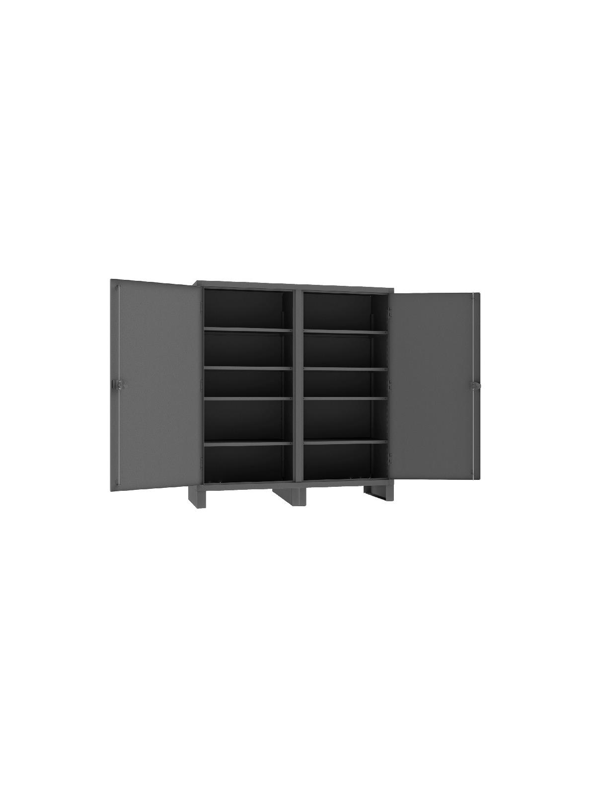 Feature rugged, all-welded 12 ga. steel construction and handsome flush door design. 4 reinforced steel shelves are adjustable on 2-1/2” centers. Includes extra heavy-duty hinge pins that secure doors to avoid sagging. Sturdy 3-point, cast steel locking handles have 3/8” dia. rods and provision for padlock (padlock not furnished).  6" high box style legs offer space for lift truck forks and can be lagged to the floor, constructed of 3/16" steel. Durable Gray powder coat finish. FOB Shipping Point.