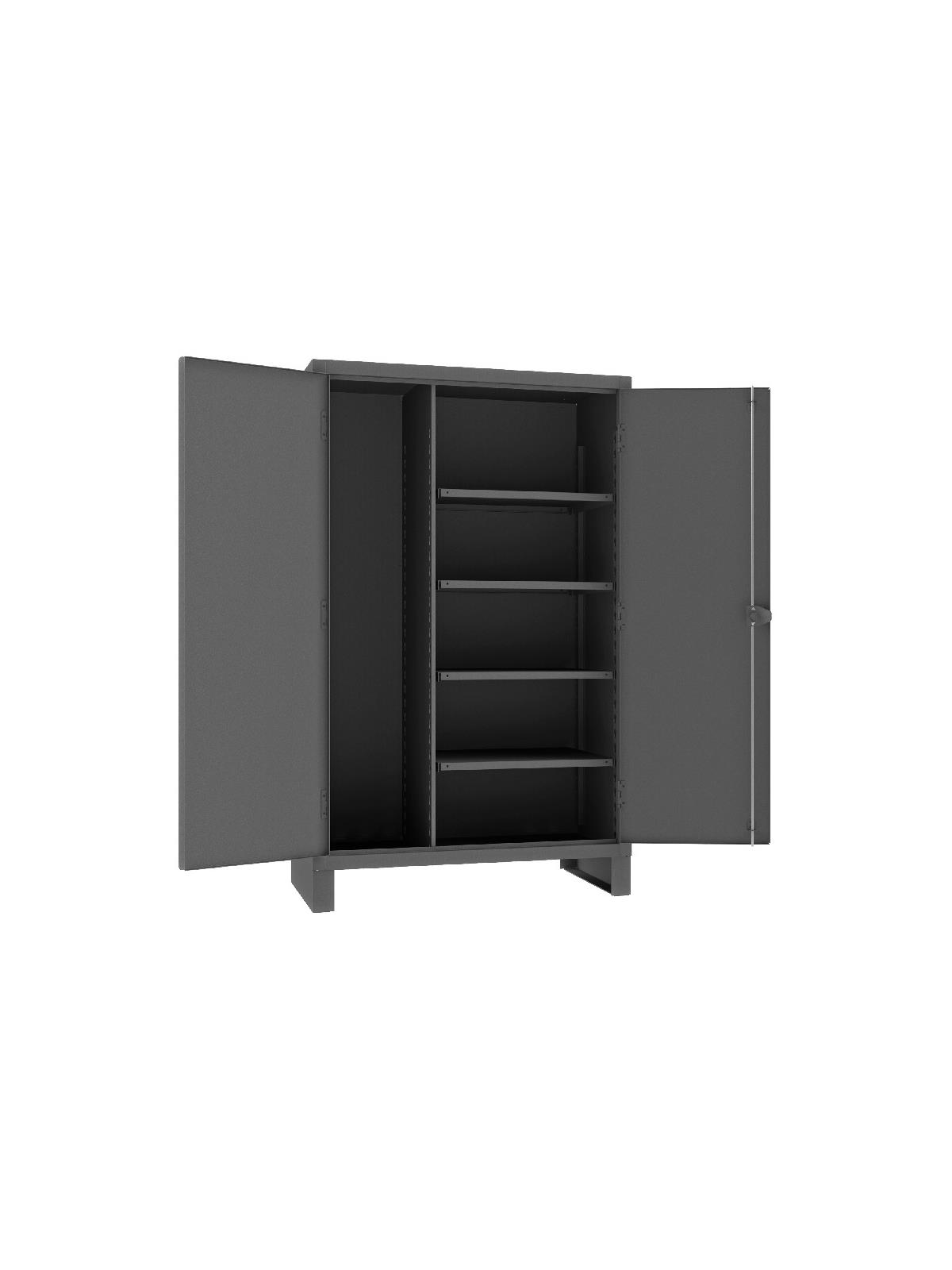 Feature rugged, all-welded 12 ga. steel construction and handsome flush door design. 4 reinforced steel shelves are adjustable on 2-1/2” centers. Includes extra heavy-duty hinge pins that secure doors to avoid sagging. Sturdy 3-point, cast steel locking handles have 3/8” dia. rods and provision for padlock (padlock not furnished).  6" high box style legs offer space for lift truck forks and can be lagged to the floor, constructed of 3/16" steel. Durable Gray powder coat finish. FOB Shipping Point.