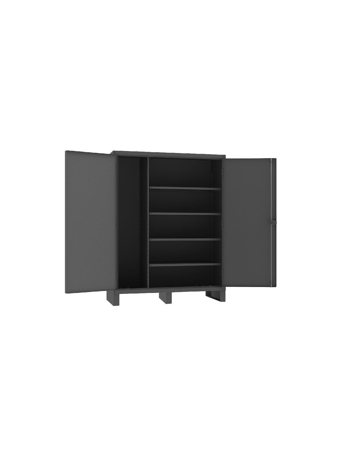 Feature rugged, all-welded 12 ga. steel construction and handsome flush door design. 4 reinforced steel shelves are adjustable on 2-1/2” centers. Includes extra heavy-duty hinge pins that secure doors to avoid sagging. Sturdy 3-point, cast steel locking handles have 3/8” dia. rods and provision for padlock (padlock not furnished).  6" high box style legs offer space for lift truck forks and can be lagged to the floor, constructed of 3/16" steel. Durable Gray powder coat finish. FOB Shipping Point.