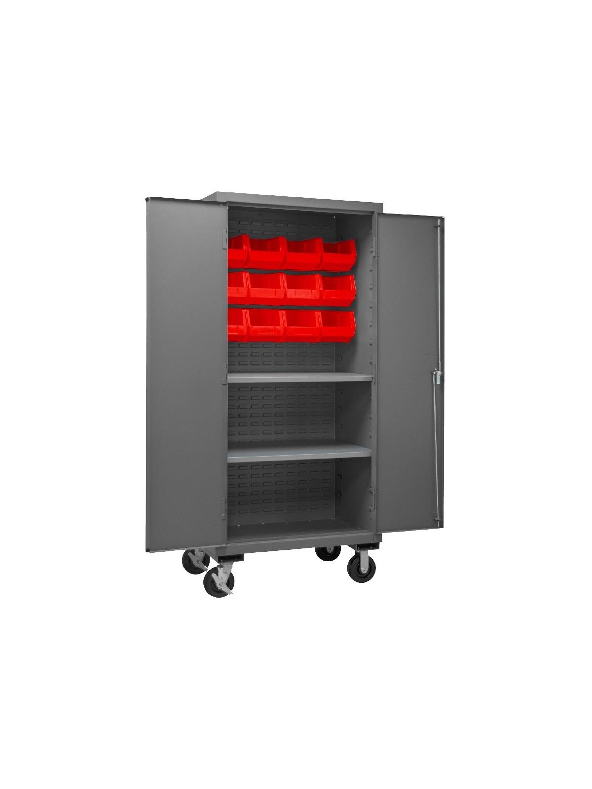 Heavy duty, all welded 14-gauge steel with 6" x 2" phenolic casters (2 rigid, 2 locking swivel). 3-point locking system with keyed handle and lock rods, 4 keys included. Side handle for easy maneuvering. Fully welded louvered panels reinforce back and hold Hook-On-Bins® and adjustable shelves rest on louvered panels and adjust on 4"centers. No tools required for installation. Hook-On-Bins® by Durham are included and install with no tools required. Gray textured powder coat finish. Available in three bin colors, Red (-1795), Blue (-5295), or Yellow (-95). FOB Shipping Point.