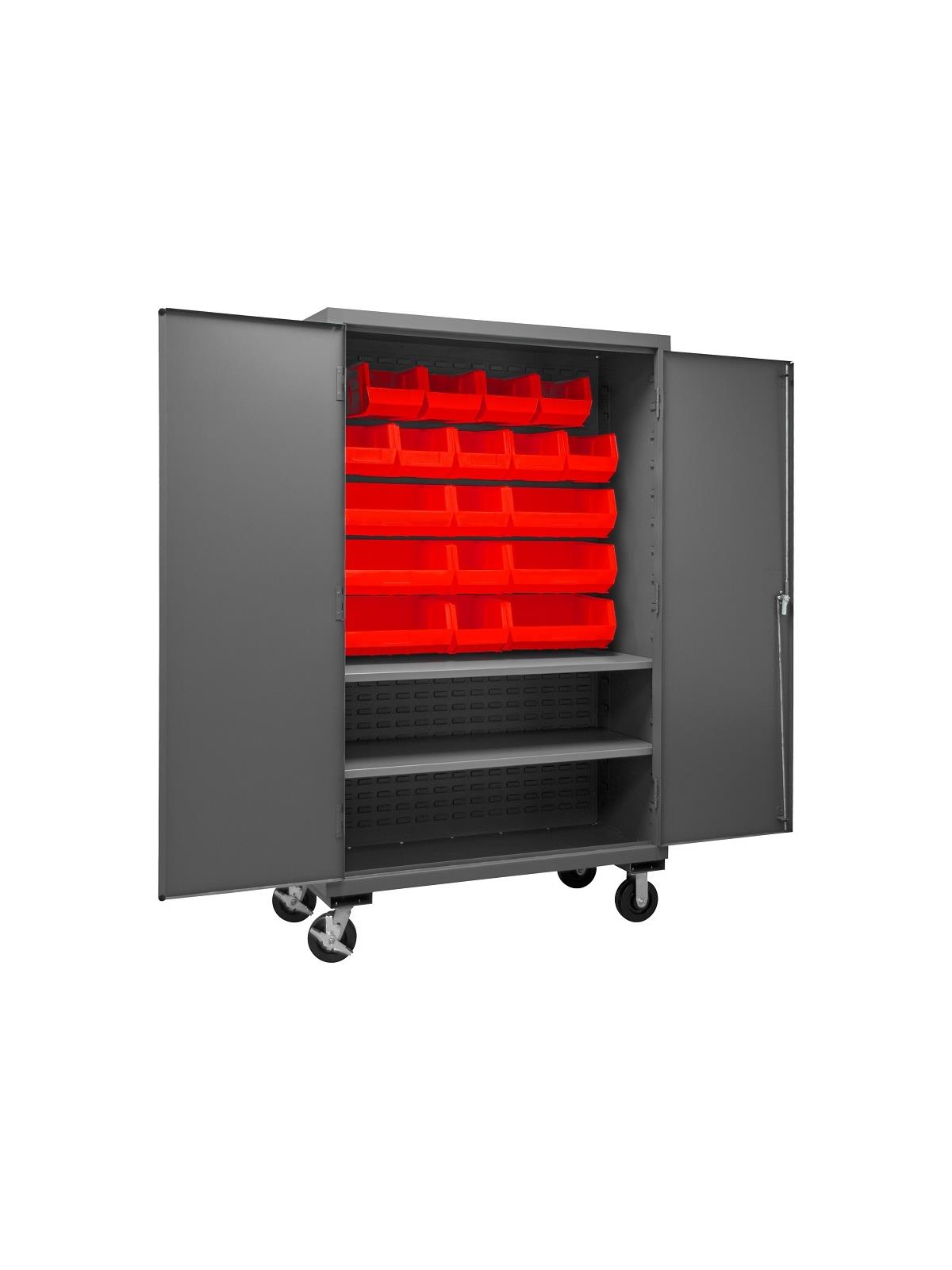 Heavy duty, all welded 14-gauge steel with 6" x 2" phenolic casters (2 rigid, 2 locking swivel). 3-point locking system with keyed handle and lock rods, 4 keys included. Side handle for easy maneuvering. Fully welded louvered panels reinforce back and hold Hook-On-Bins® and adjustable shelves rest on louvered panels and adjust on 4"centers. No tools required for installation. Hook-On-Bins® by Durham are included and install with no tools required. Gray textured powder coat finish. Available in three bin colors, Red (-1795), Blue (-5295), or Yellow (-95). FOB Shipping Point. Steel surcharges may apply.