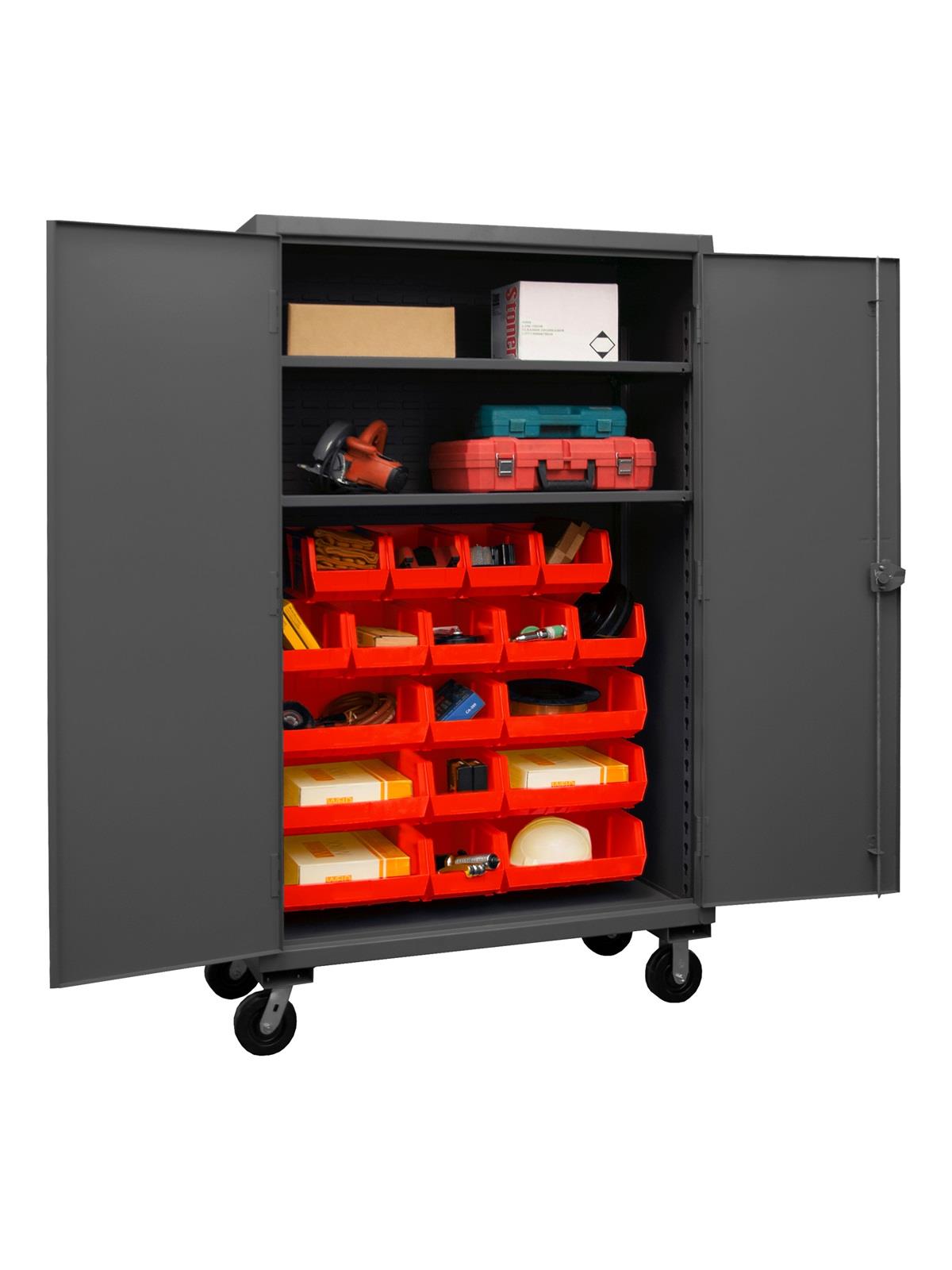 Heavy duty, all welded 12-gauge steel with 6" x 2" phenolic casters (2 rigid, 2 locking swivel). 3-point locking system with keyed handle and lock rods, 4 keys included. Side handle for easy maneuvering. Fully welded louvered panels reinforce back and hold Hook-On-Bins®. Shelves bolt into place easily using fasteners provided and adjust on 2-1/4" centers. No tools required for installation.  Hook-On-Bins® by Durham are included and install with no tools required. Gray textured powder coat finish. Available in three bin colors, Red (-1795), Blue (-5295), or Yellow (-95). FOB Shipping Point.