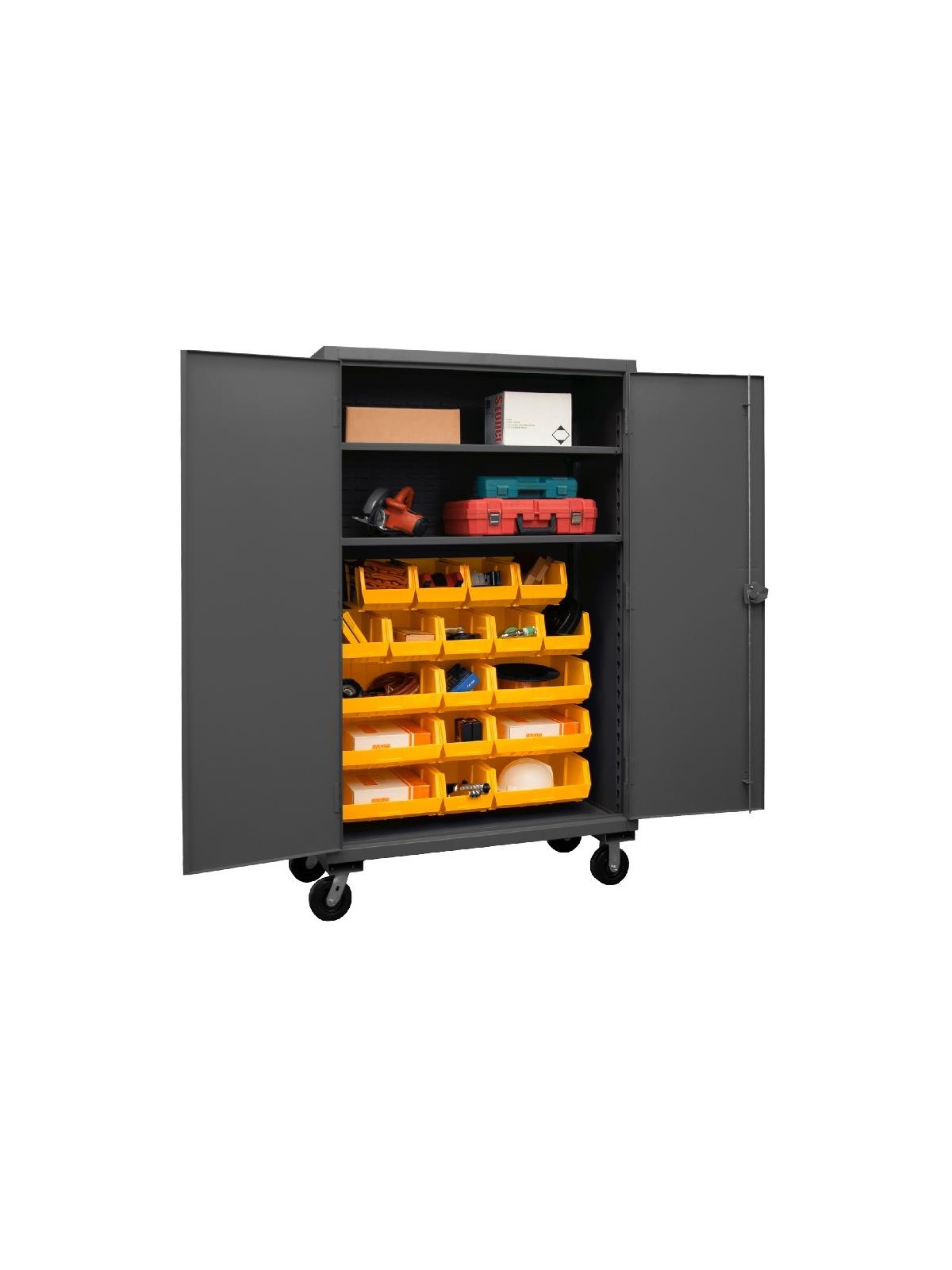 Heavy duty, all welded 12-gauge steel with 6" x 2" phenolic casters (2 rigid, 2 locking swivel). 3-point locking system with keyed handle and lock rods, 4 keys included. Side handle for easy maneuvering. Fully welded louvered panels reinforce back and hold Hook-On-Bins®. Shelves bolt into place easily using fasteners provided and adjust on 2-1/4" centers. No tools required for installation.  Hook-On-Bins® by Durham are included and install with no tools required. Gray textured powder coat finish. Available in three bin colors, Red (-1795), Blue (-5295), or Yellow (-95). FOB Shipping Point.