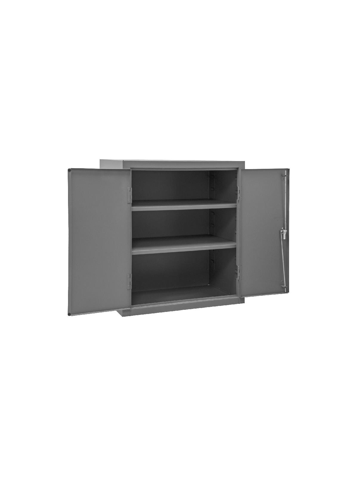 Industrial duty, all welded 16-gauge steel with 3-point locking system with keyed handle and lock rods, 4 keys included. Adjustable shelves rest on louvered panels and adjust on 4" centers. No tools required for installation. H2505 & H2506 models have 6"H base/legs which provide access for forklifts, pre-punched holes allow for lagging to the floor. (Constructed of 3/16" steel) Gray, textured powder coat finish. FOB Shipping Point.