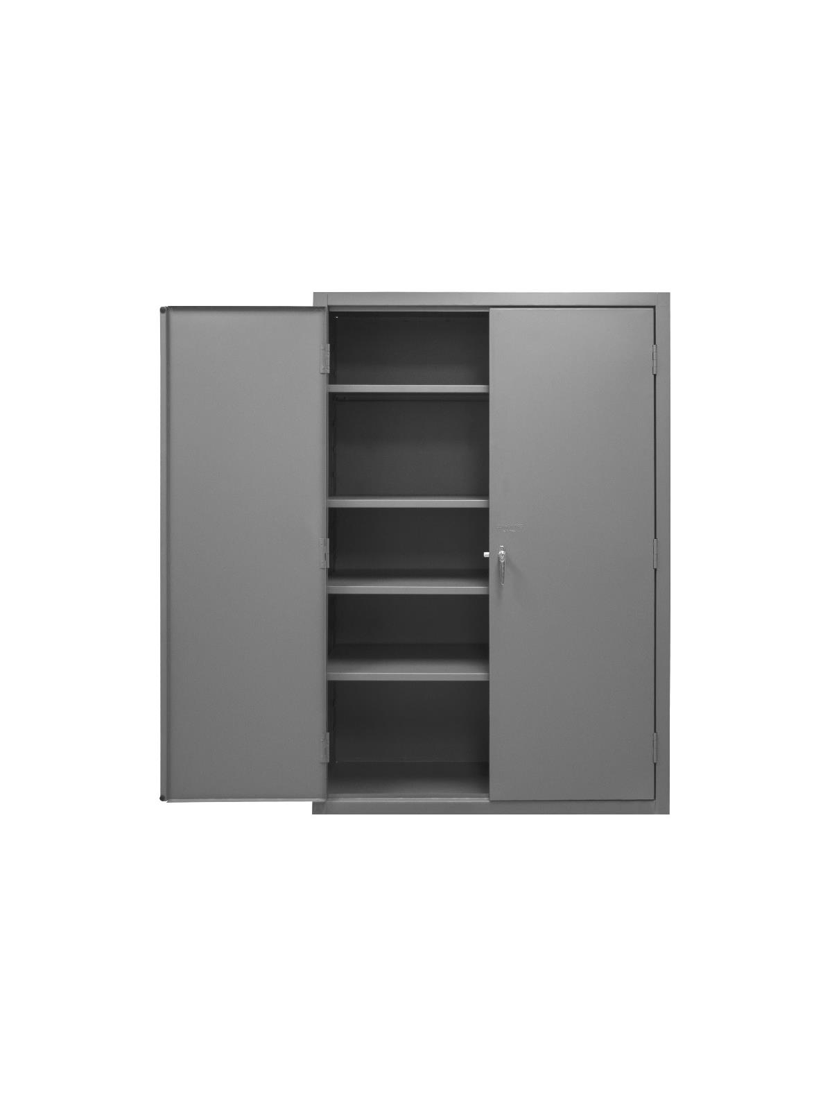 Industrial duty, all welded 16-gauge steel with 3-point locking system with keyed handle and lock rods, 4 keys included. Adjustable shelves rest on louvered panels and adjust on 4" centers. No tools required for installation. H2505 & H2506 models have 6"H base/legs which provide access for forklifts, pre-punched holes allow for lagging to the floor. (Constructed of 3/16" steel) Gray, textured powder coat finish. FOB Shipping Point.