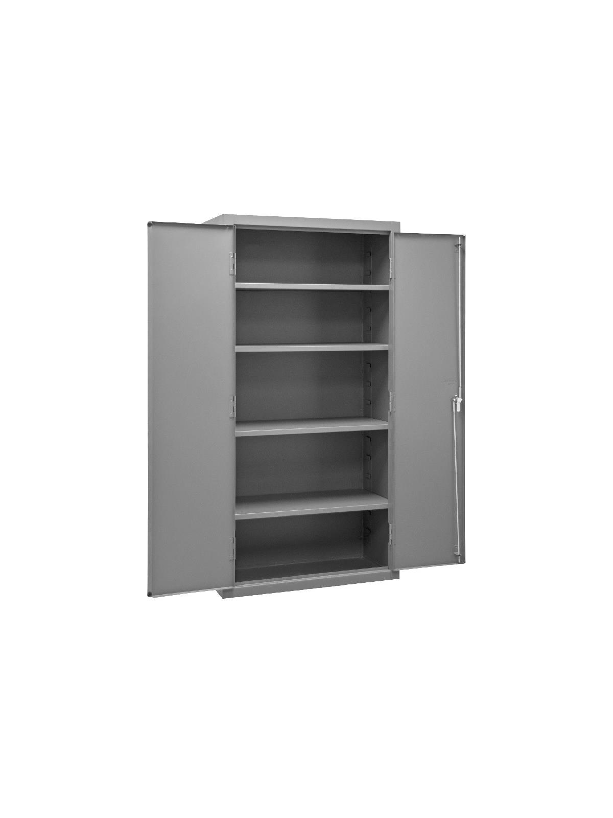 Industrial duty, all welded 16-gauge steel with 3-point locking system with keyed handle and lock rods, 4 keys included. Adjustable shelves rest on louvered panels and adjust on 4" centers. No tools required for installation. H2505 & H2506 models have 6"H base/legs which provide access for forklifts, pre-punched holes allow for lagging to the floor. (Constructed of 3/16" steel) Gray, textured powder coat finish. FOB Shipping Point.