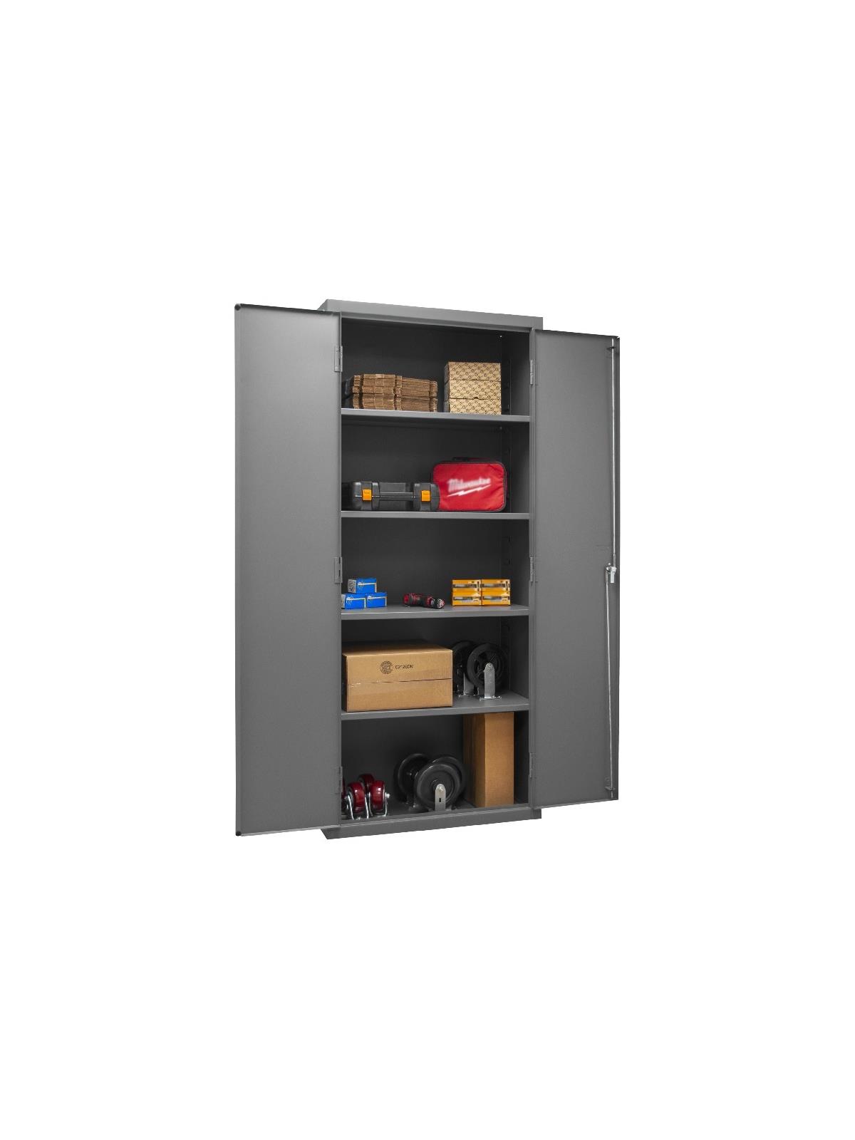 Industrial duty, all welded 16-gauge steel with 3-point locking system with keyed handle and lock rods, 4 keys included. Adjustable shelves rest on louvered panels and adjust on 4" centers. No tools required for installation. H2505 & H2506 models have 6"H base/legs which provide access for forklifts, pre-punched holes allow for lagging to the floor. (Constructed of 3/16" steel) Gray, textured powder coat finish. FOB Shipping Point.