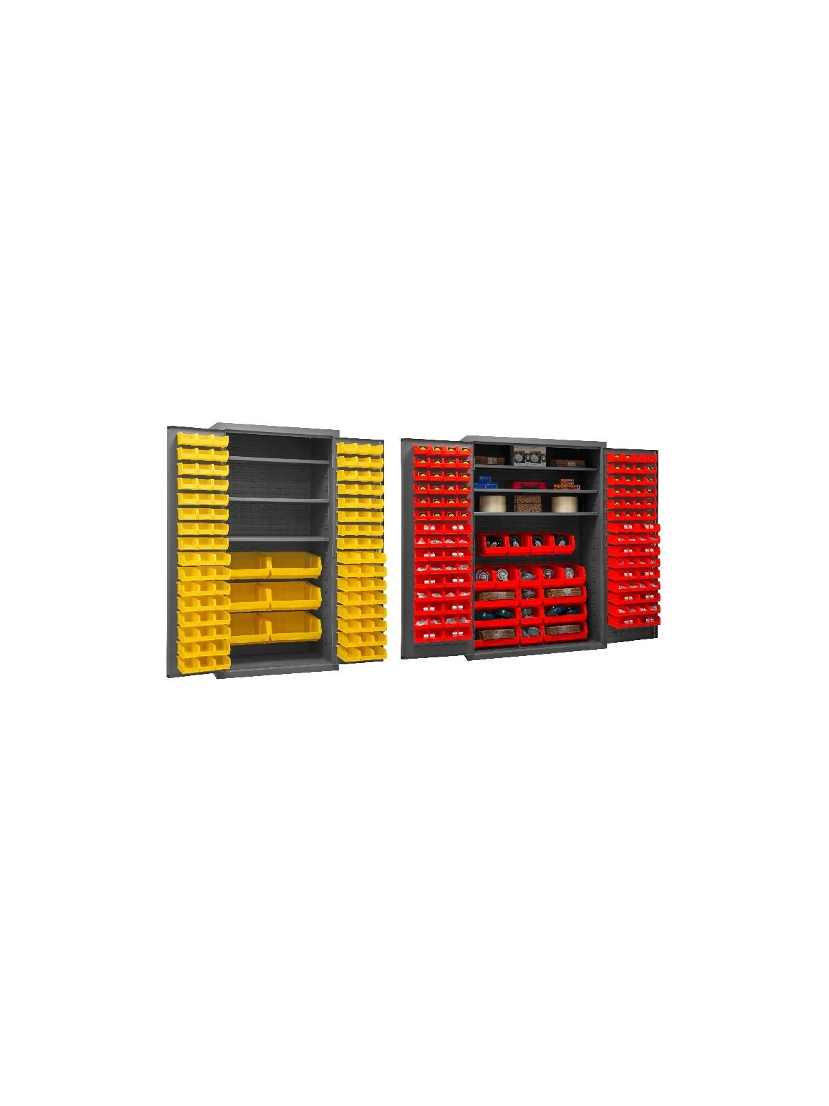 3-point locking system with keyed handle and lock rods, 4 keys included. Full height, formed and recessed doors with heavy duty, leaf hinges to prevent sagging and warping. Adjustable shelves rest on louvered panels and adjust on 4" centers. No tools required for installation. Fully welded louvered panels reinforce door and accommodate Hook-On Bins®. Hook-On Bins® installed easily with no tools required. Hook-On Bins® are included. Durable, gray, textured powder coat finish. Available in three bin colors, Red (-1795), Blue (-5295), or Yellow (-95). FOB Shipping Point.