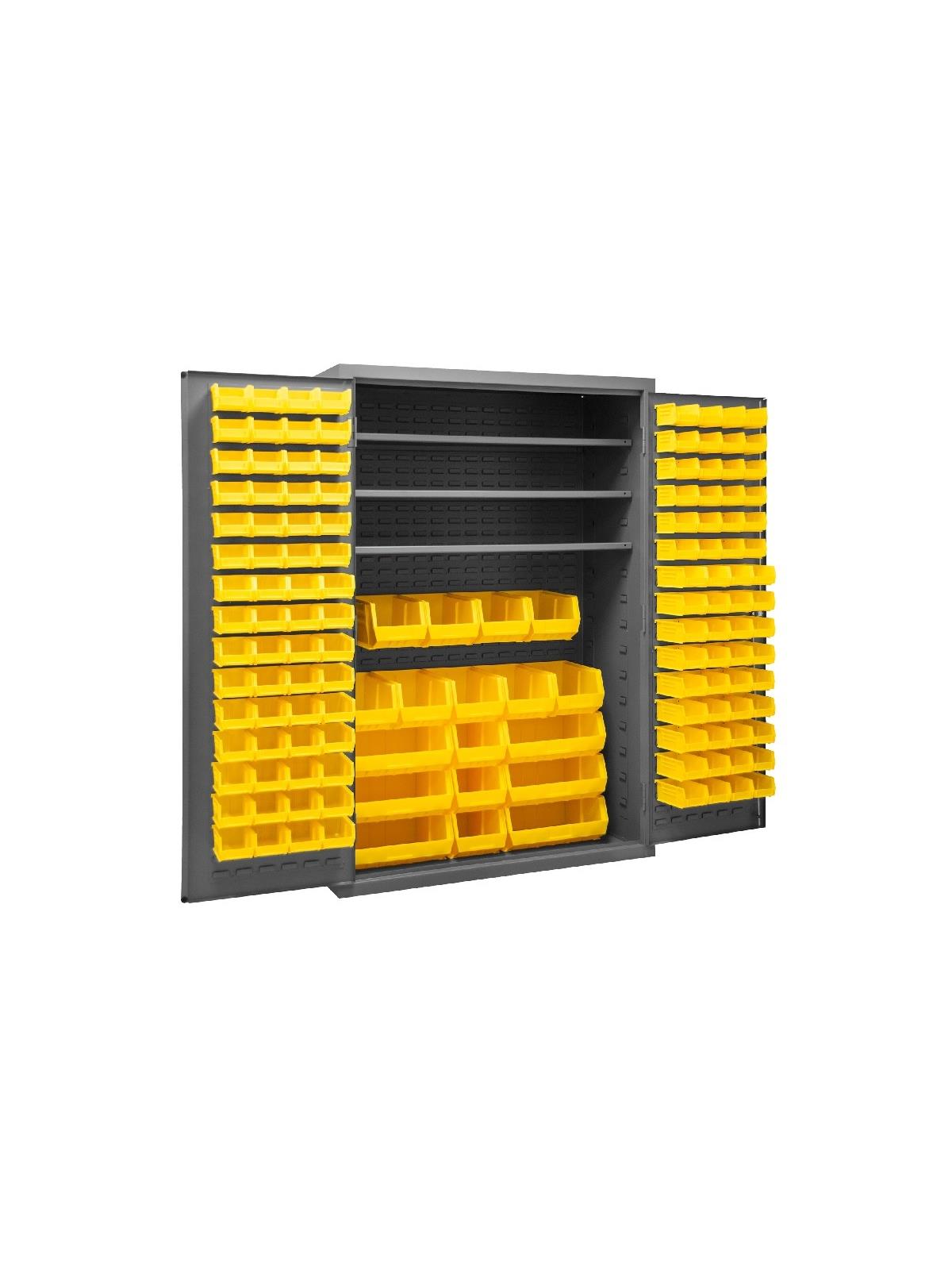 3-point locking system with keyed handle and lock rods, 4 keys included. Full height, formed and recessed doors with heavy duty, leaf hinges to prevent sagging and warping. Adjustable shelves rest on louvered panels and adjust on 4" centers. No tools required for installation. Fully welded louvered panels reinforce door and accommodate Hook-On Bins®. Hook-On Bins® installed easily with no tools required. Hook-On Bins® are included. Durable, gray, textured powder coat finish. Available in three bin colors, Red (-1795), Blue (-5295), or Yellow (-95). FOB Shipping Point.