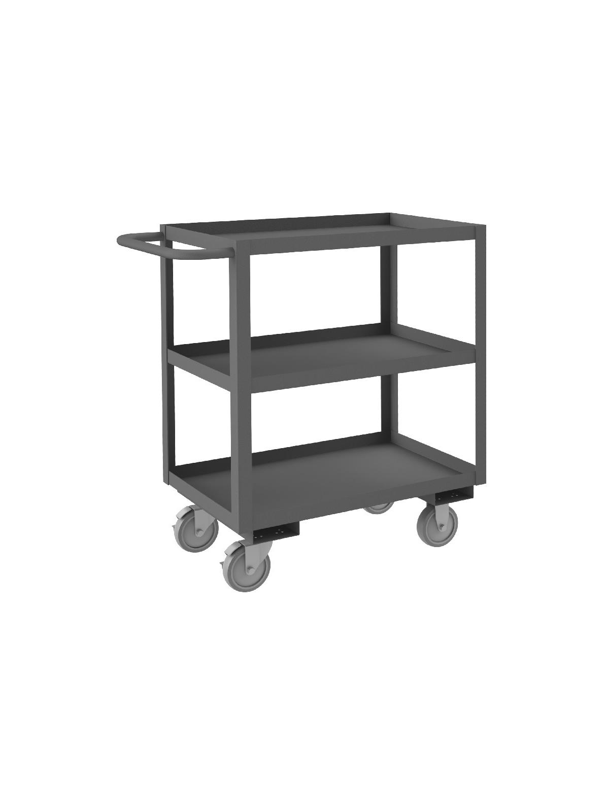Shelf carts are constructed with 1-1/2" x 1/8" angle iron uprights for added strength. Heavy duty 14 gauge steel shelves. Sturdy tubular push handle. Perfect for transporting heavier parts or stock items. Shelf Stock Carts are available in 1,200 lbs. or 3,000 lbs. capacities. FOB Shipping Point.