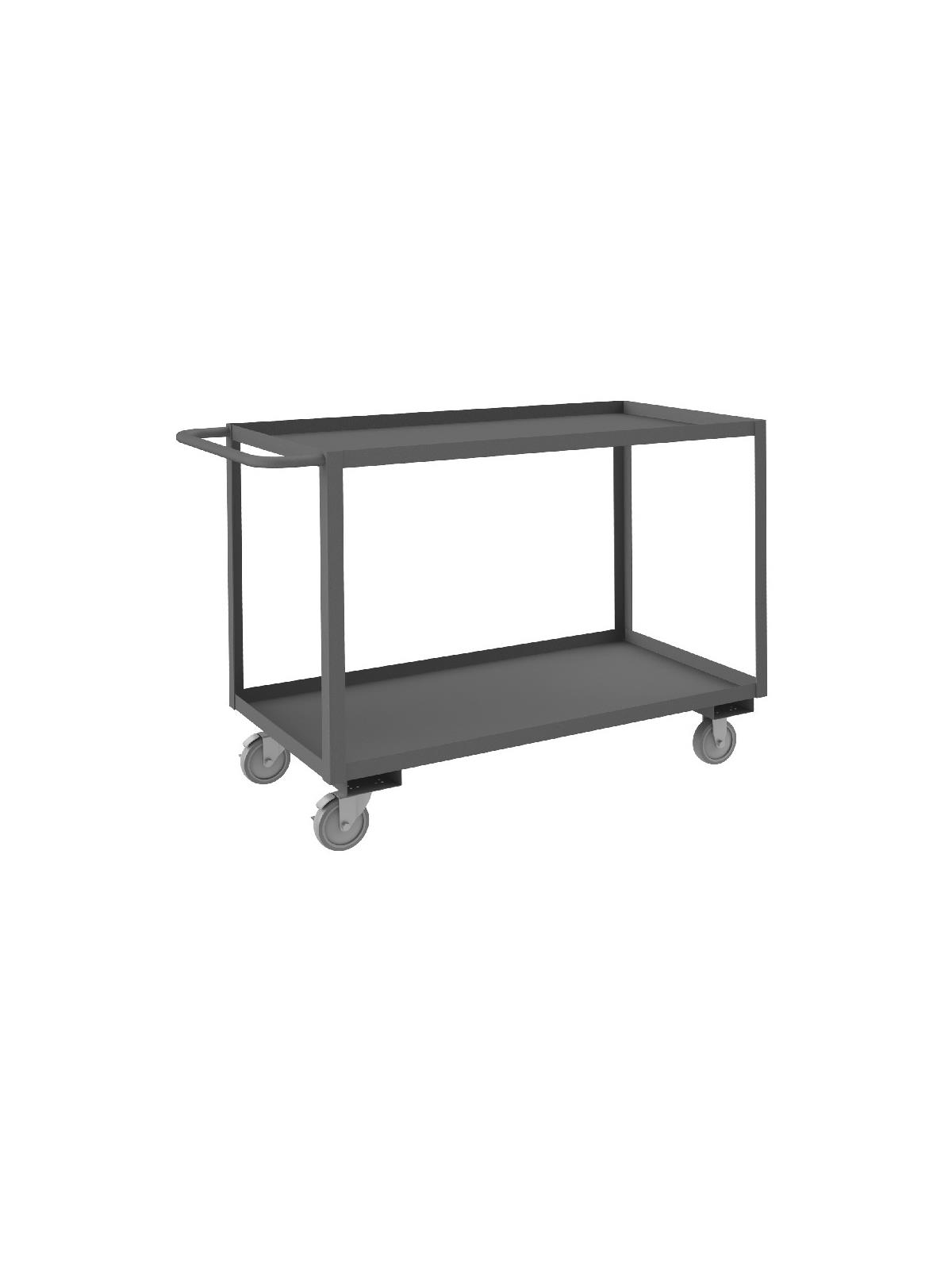 Shelf carts are constructed with 1-1/2" x 1/8" angle iron uprights for added strength. Heavy duty 14 gauge steel shelves. Sturdy tubular push handle. Perfect for transporting heavier parts or stock items. Shelf Stock Carts are available in 1,200 lbs. or 3,000 lbs. capacities. FOB Shipping Point.