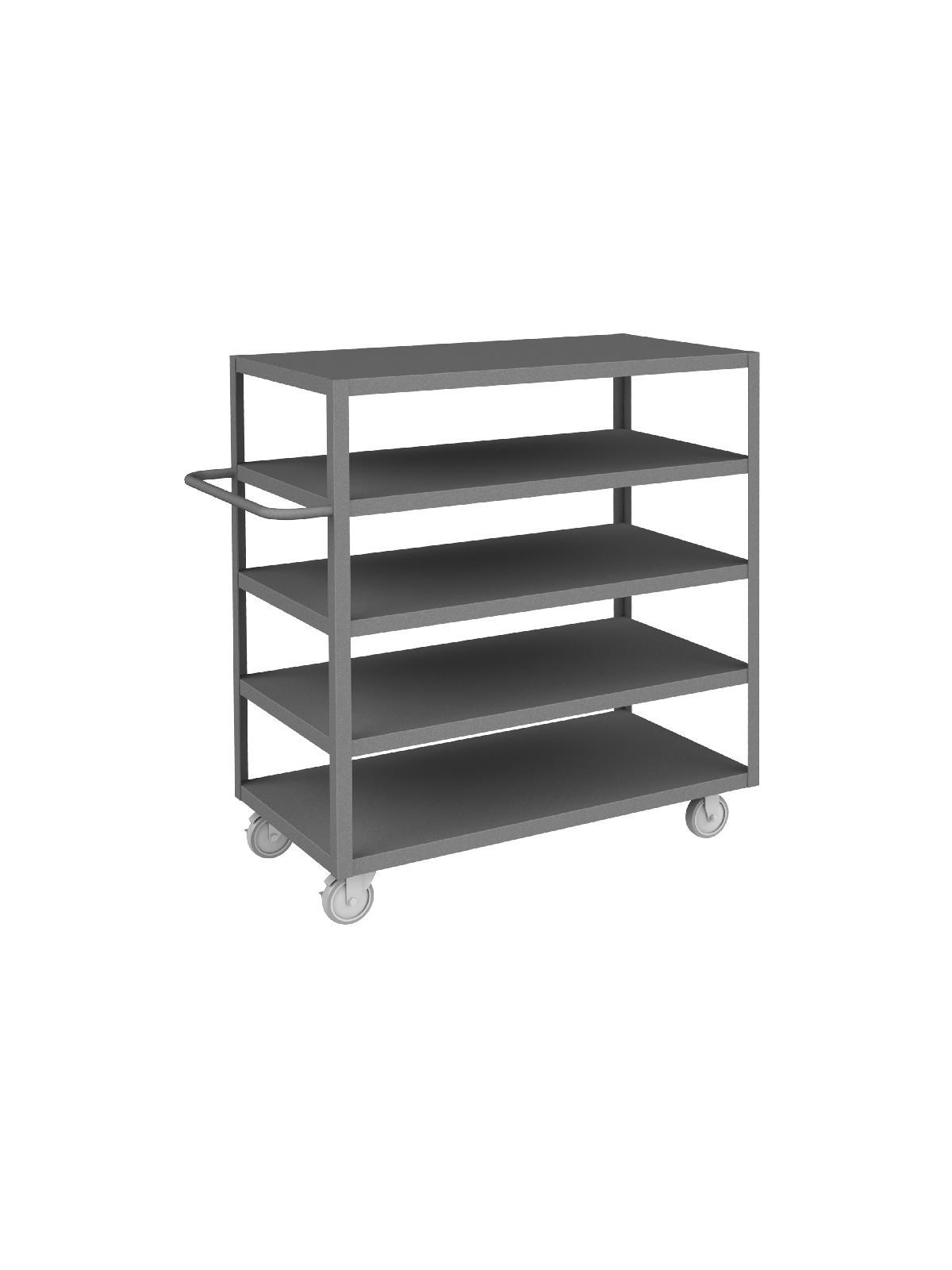 Shelf carts are constructed with 1-1/2" x 1/8" angle iron uprights for added strength. Heavy duty 14 gauge steel shelves. Sturdy tubular push handle. Perfect for transporting heavier parts or stock items. Shelf Stock Carts are available in 1,200 lbs. or 3,000 lbs. capacities. FOB Shipping Point.