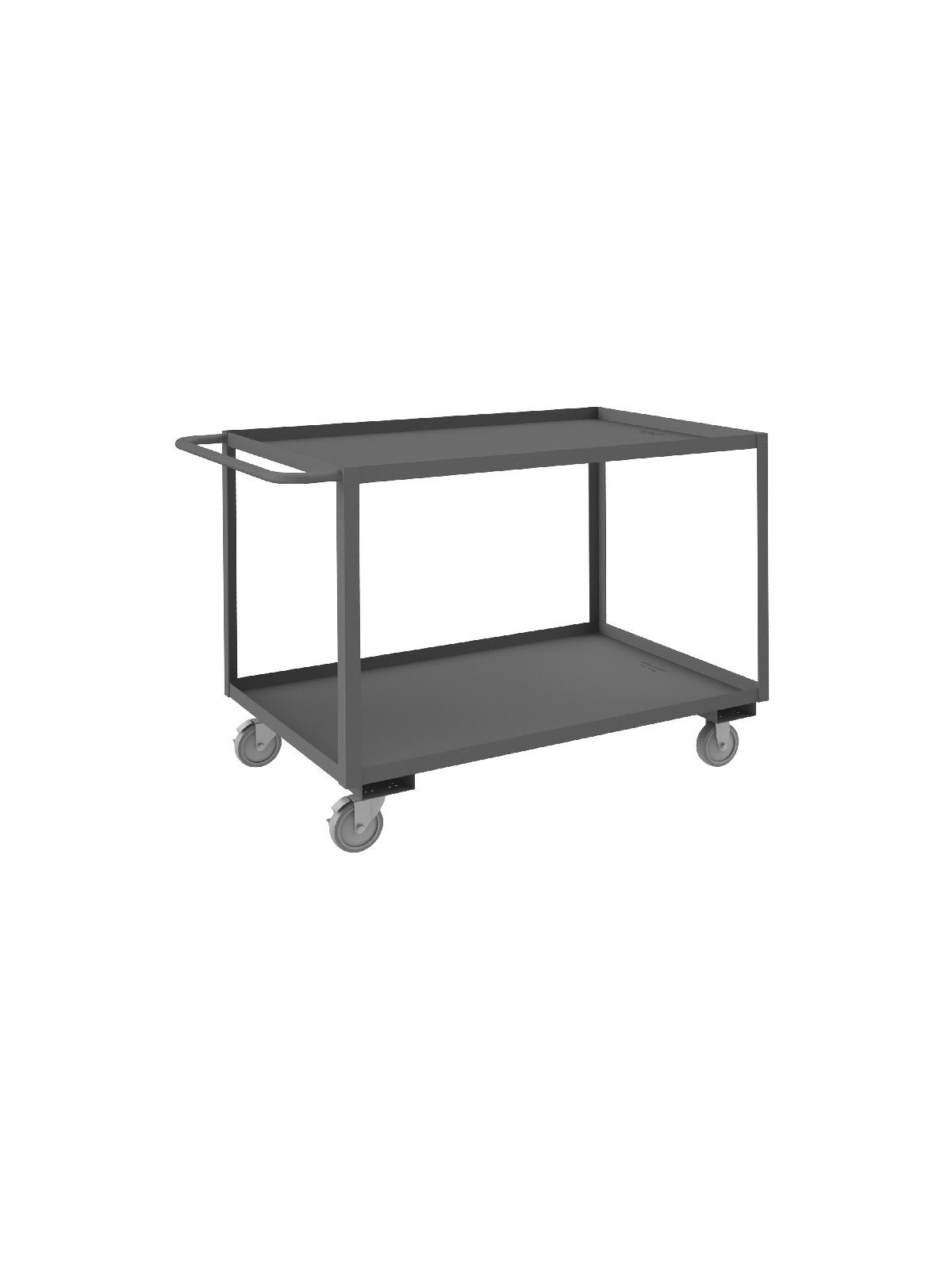 Shelf carts are constructed with 1-1/2" x 1/8" angle iron uprights for added strength. Heavy duty 14 gauge steel shelves. Sturdy tubular push handle. Perfect for transporting heavier parts or stock items. Shelf Stock Carts are available in 1,200 lbs. or 3,000 lbs. capacities. FOB Shipping Point.