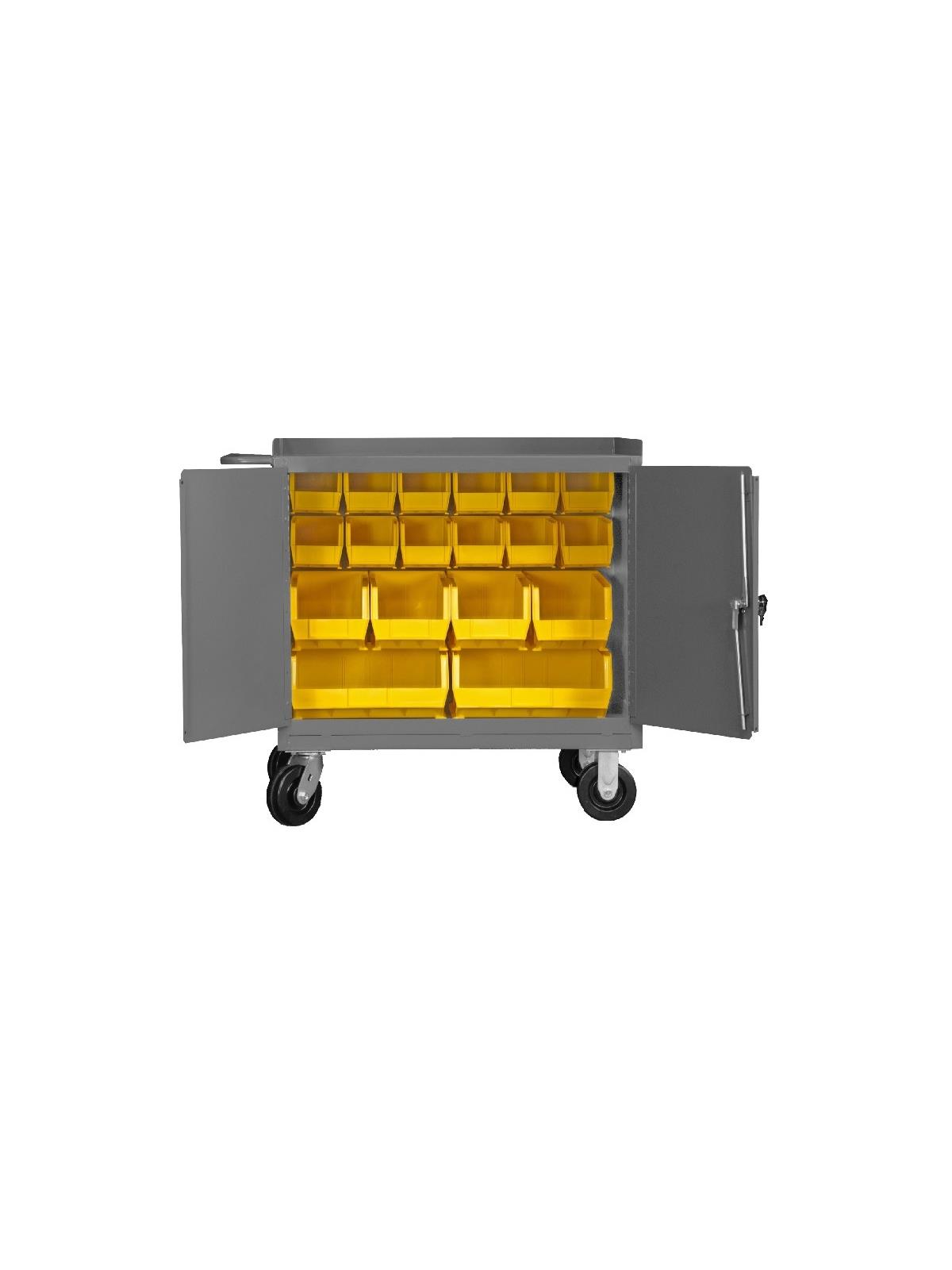 Made of heavy duty 16 ga. steel construction. Convenient sturdy work surface with back stop. Tubular push handle allows for ease of mobility. Rolls smoothly on 6" x 2" phenolic casters (2) swivel and (2) rigid. Back louvered panel accommodates Hook-On-Bins®. Doors lock securely with a 3 point locking handle and 4 keys. Durable, gray, textured powder coat finish. FOB Shipping Point.