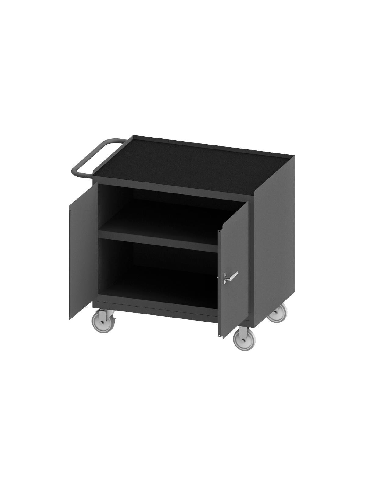 Bench cabinets are constructed of 14 gauge steel. Convenient sturdy work surface with back and end stops on the work surface prevents parts from falling off during transport (MT units not included). Tubular handle for easy maneuverability. Cabinet doors have a 3 point locking system with 4 keys. Rolls smoothly on 5" polyurethane bolt-on casters, (2) swivel with side brakes and (2) rigid. 36"W model has 1,200 lbs. capacity. 48"W model has 2,000 lbs. capacity and includes a floor lock to keep the unit in place while you work. FOB Shipping Point.