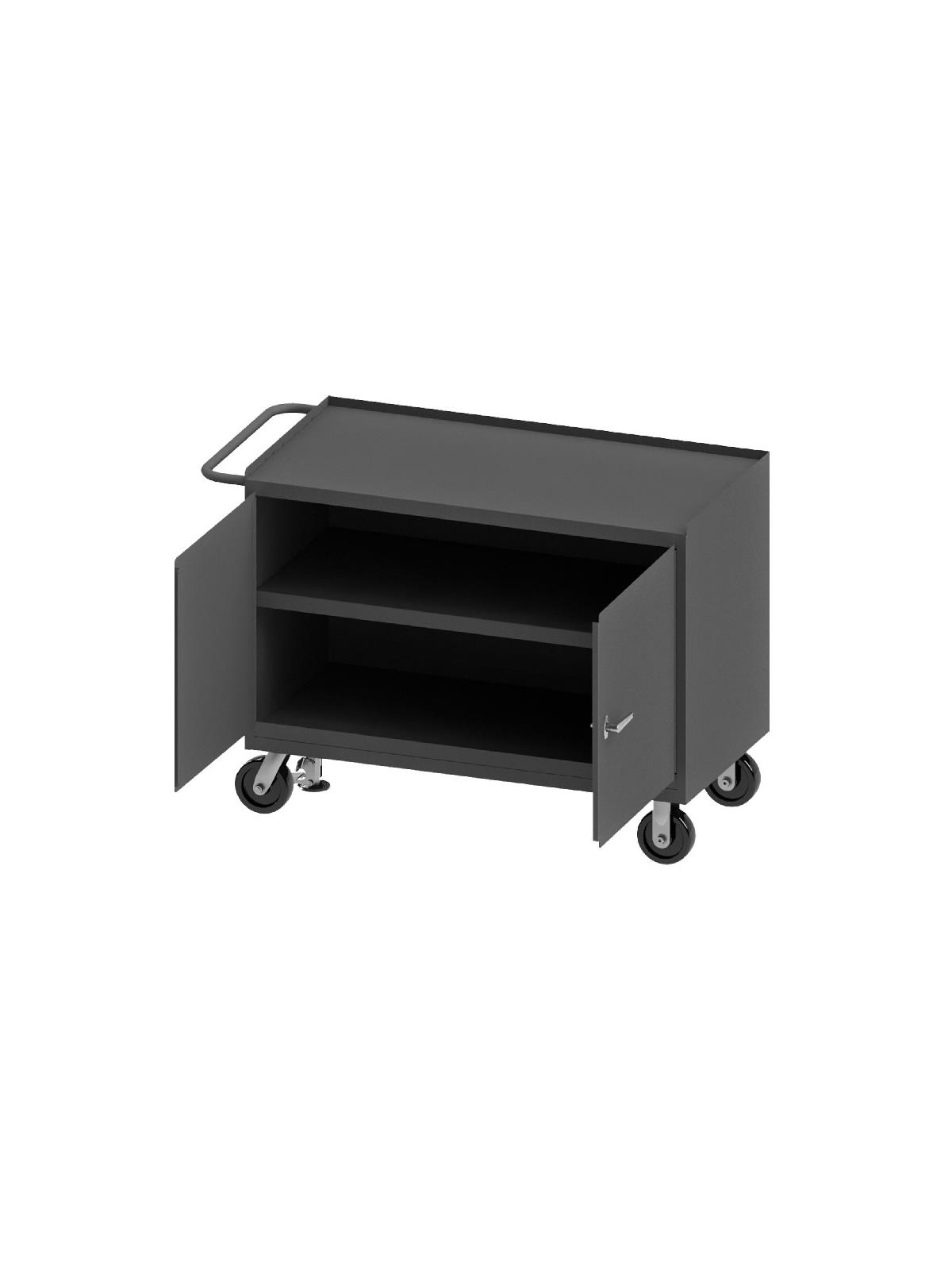 Bench cabinets are constructed of 14 gauge steel. Convenient sturdy work surface with back and end stops on the work surface prevents parts from falling off during transport (MT units not included). Tubular handle for easy maneuverability. Cabinet doors have a 3 point locking system with 4 keys. Rolls smoothly on 5" polyurethane bolt-on casters, (2) swivel with side brakes and (2) rigid. 36"W model has 1,200 lbs. capacity. 48"W model has 2,000 lbs. capacity and includes a floor lock to keep the unit in place while you work. FOB Shipping Point.