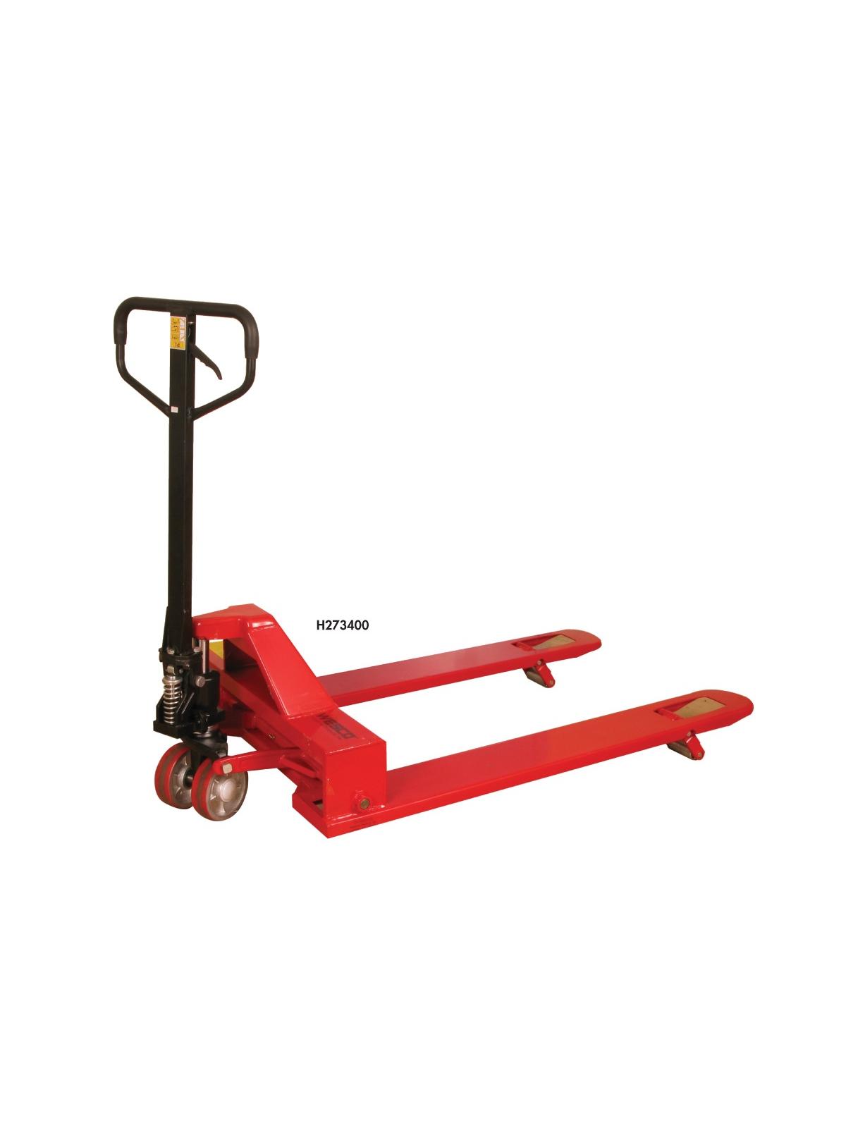 Safely and easily lift and move pallets. Overload bypass, reinforced forks, rubber-coated handle measures 47" in height. 101° steering and can enter pallet from all four sides. Adjustable fork connecting rods, steel 1.7" load wheels and 6" polyurethane steering wheels. Lowered/raised fork height measures 1-3/4" / 6". FOB Shipping Point.