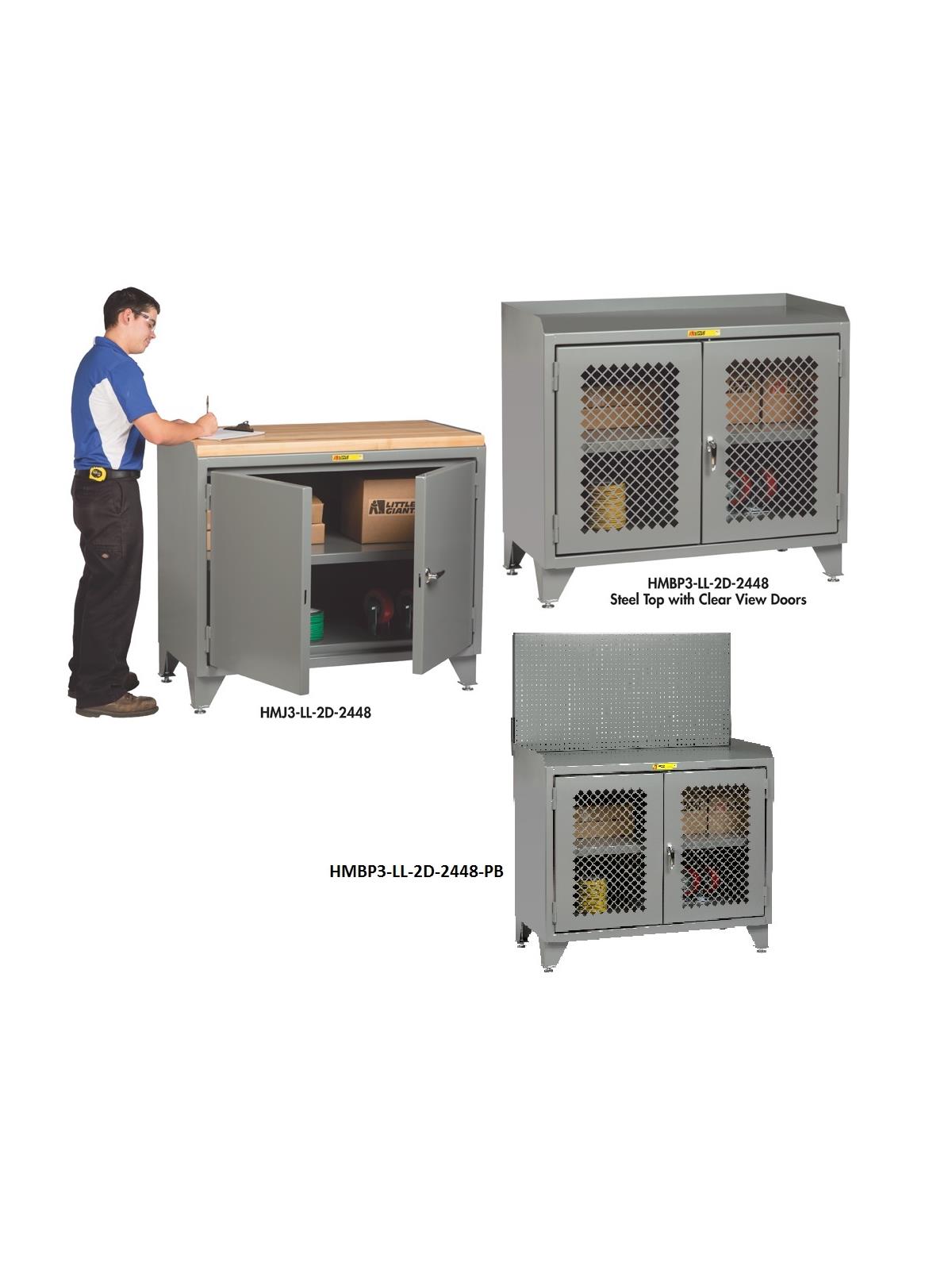 The top work surface measures 24" x 48", is 41" high and is surrounded by retaining lip on three sides (except 1-3/4" Butcher Block Top models). Available in 3 standard work top surfaces. Keyed handle and 3-point latching mechanism. Available with either a Fixed center shelf or Heavy-Duty Drawer. Clearview doors provide ventilation and visibility. Heavy-duty leg levelers adjust for up to 3" of additional height. Durable powder coated gray finish. Also available with factory installed pegboard or louvered panel. FOB Shipping Point.