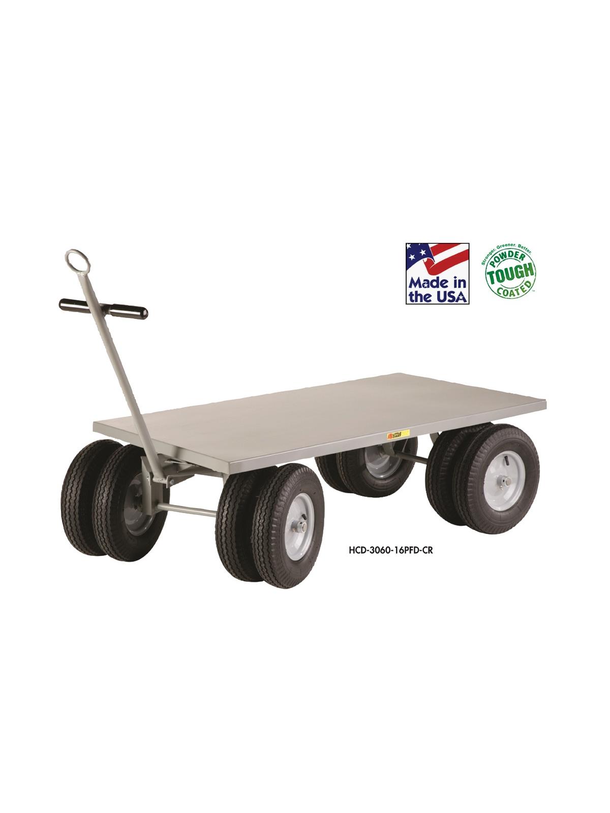 8 wheels distribute the load over greater surface area. 16" x 4" pneumatic wheels are 4 ply with roller bearings and 1" axles. 12 gauge steel deck is available with flush edges or a 1-1/2" retaining lip. Ring Drawbar/T-handle with 2-1/2" inside dimension ring allows for intermittent low speed towing. FOB Shipping Point. Surcharge may apply.