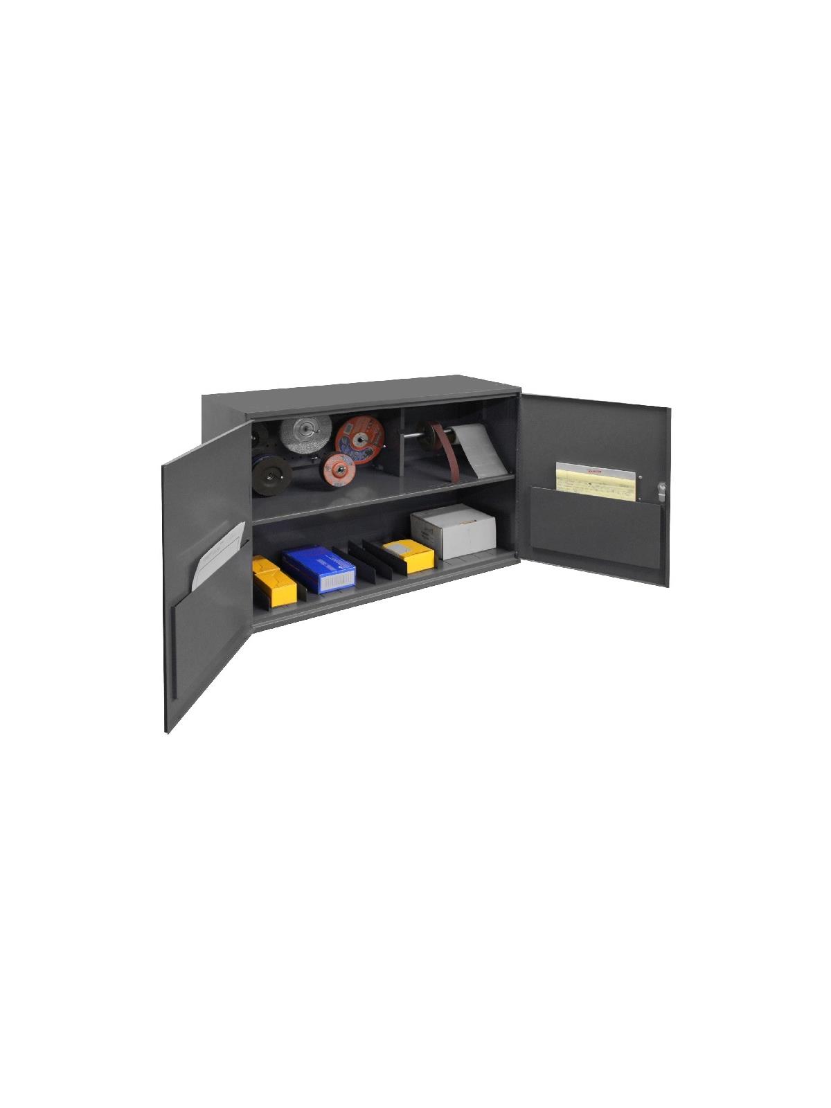 Locking system with keys included. Keyhole slots in the back of the unit for wall mounting. (1) Sandpaper rod included. (6) removable dividers. Pegboard is 21 x 7-11/16" and includes 5 pegboard hooks. Modular to our 12" deep bins and other cabinets of the same size. Some assembly is required. Durable, gray, powder coat finish. FOB Shipping Point.