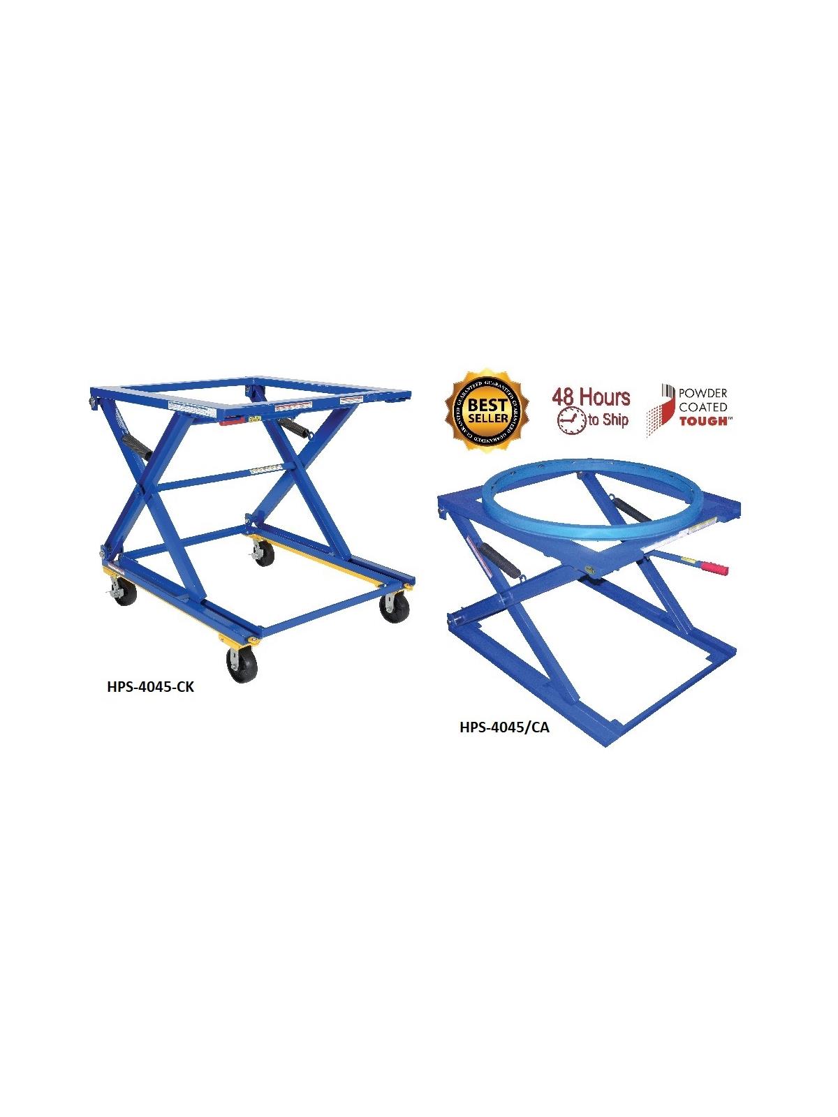 The Adjustable Height Pallet Stands are designed to manually adjust to three different ergonomic working heights. Unit includes a three position manual adjusting bar with spring assist to help raise and lower the deck. The Pallet Stand must be empty when adjusting the height. Unit is welded steel construction with baked-in powder-coated tough finish. The optional bolt-on manual carousel, suffix CA, is 40" in diameter by 2" tall and rotates 360°. The caster feature, suffix CK, consists of 6" x 2" glass-filled nylon two (2) rigid and two (2) swivel casters with brake. FOB Shipping Point. Due to tariffs and market conditions, pricing subject to change.