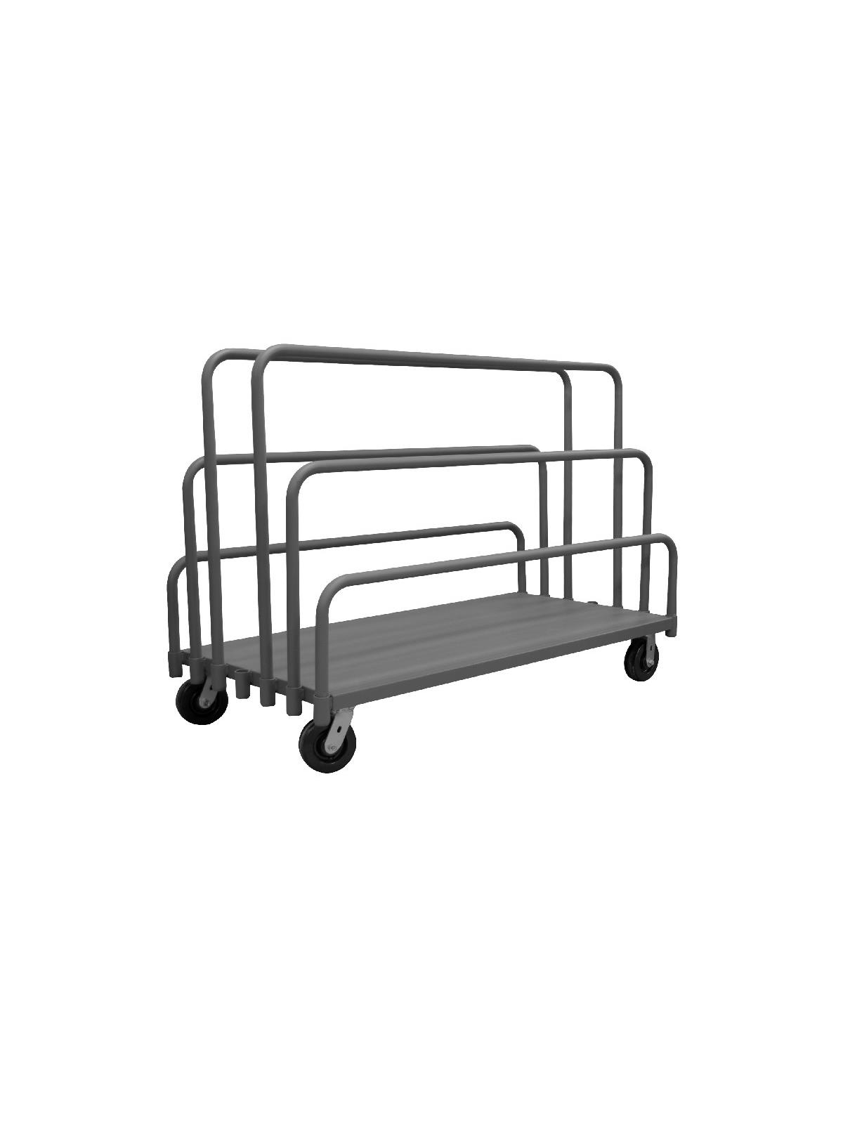 Easy to access and pick up on-board product. Create multiple opening sizes by adjusting dividers. All casters: 2 rigid, 2 swivel. Allows for the storage and transportation of various sizes of panels and product. Gray, textured, powder coat finish. FOB Shipping Point.
