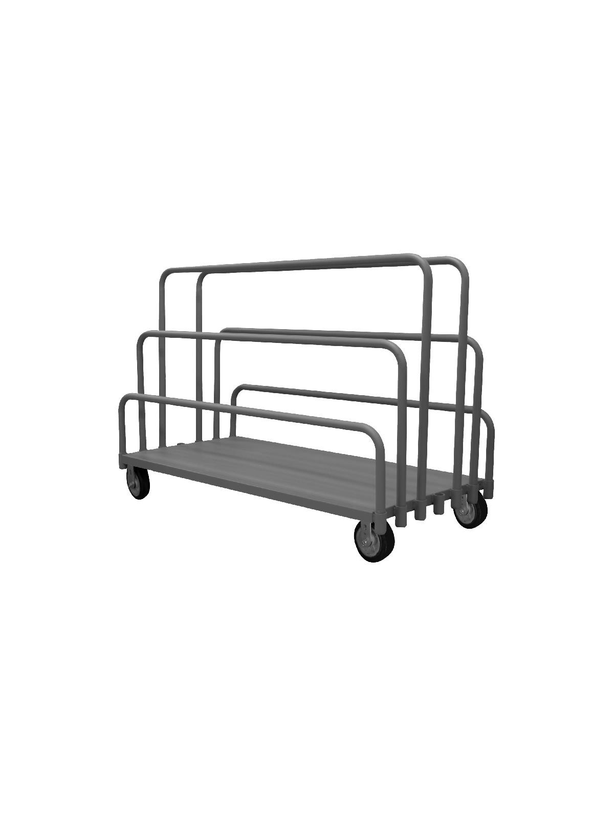 Easy to access and pick up on-board product. Create multiple opening sizes by adjusting dividers. All casters: 2 rigid, 2 swivel. Allows for the storage and transportation of various sizes of panels and product. Gray, textured, powder coat finish. FOB Shipping Point.