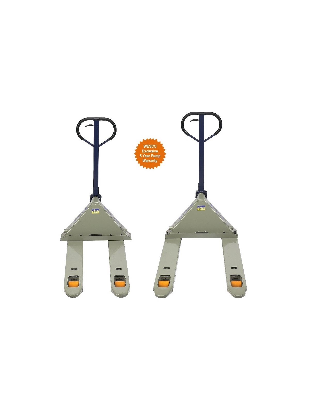 One truck does the work of two. Handles loads up to 5500 lbs. Features 3"W. polyurethane load wheels. Adjustable fork connecting rods. Overload bypass valve. Rubber coated handle. Entry and exit rollers. 7.5" raised height. 3" lowered height. 3" load wheels and 8" steering wheels -- both mold-on polyurethane. FOB Shipping Point.