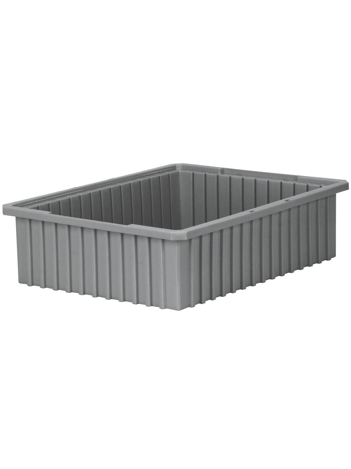 Intersecting dividers allow the container to be subdivided in separate compartments as small as 1-1/8" sq. Injection-molded from high density polyethylene -- resists most solvents and chemicals. Compatible with most racks, shelving and automated material handling equipment. Available in Red, Blue, or Gray. Dividers and lids sold separately. FOB Shipping Point.