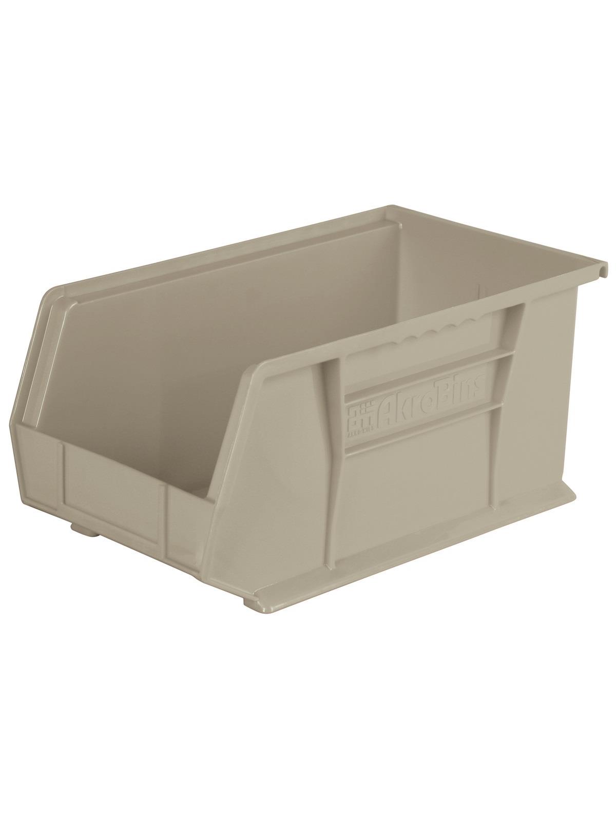 AkroBins are heavy-duty and securely stack on top of each other, sit on shelving, and hang from Akro-Mils racks, panels, rails and carts. Unaffected by weak acids and alkalis the sturdy one piece construction is water, rust and corrosion-proof. Finger grip allows for easy handling. Large label slot for easy identification of contents. Autoclavable up to 250° F. Guaranteed not to crack or break under normal load conditions as stated in the 1-year limited warranty. Optional dividers and labels available, see Related Items tab. AkroBins available in Red, Yellow, Blue, Green, Black, Stone, and Semi-Clear. FOB Shipping Point.