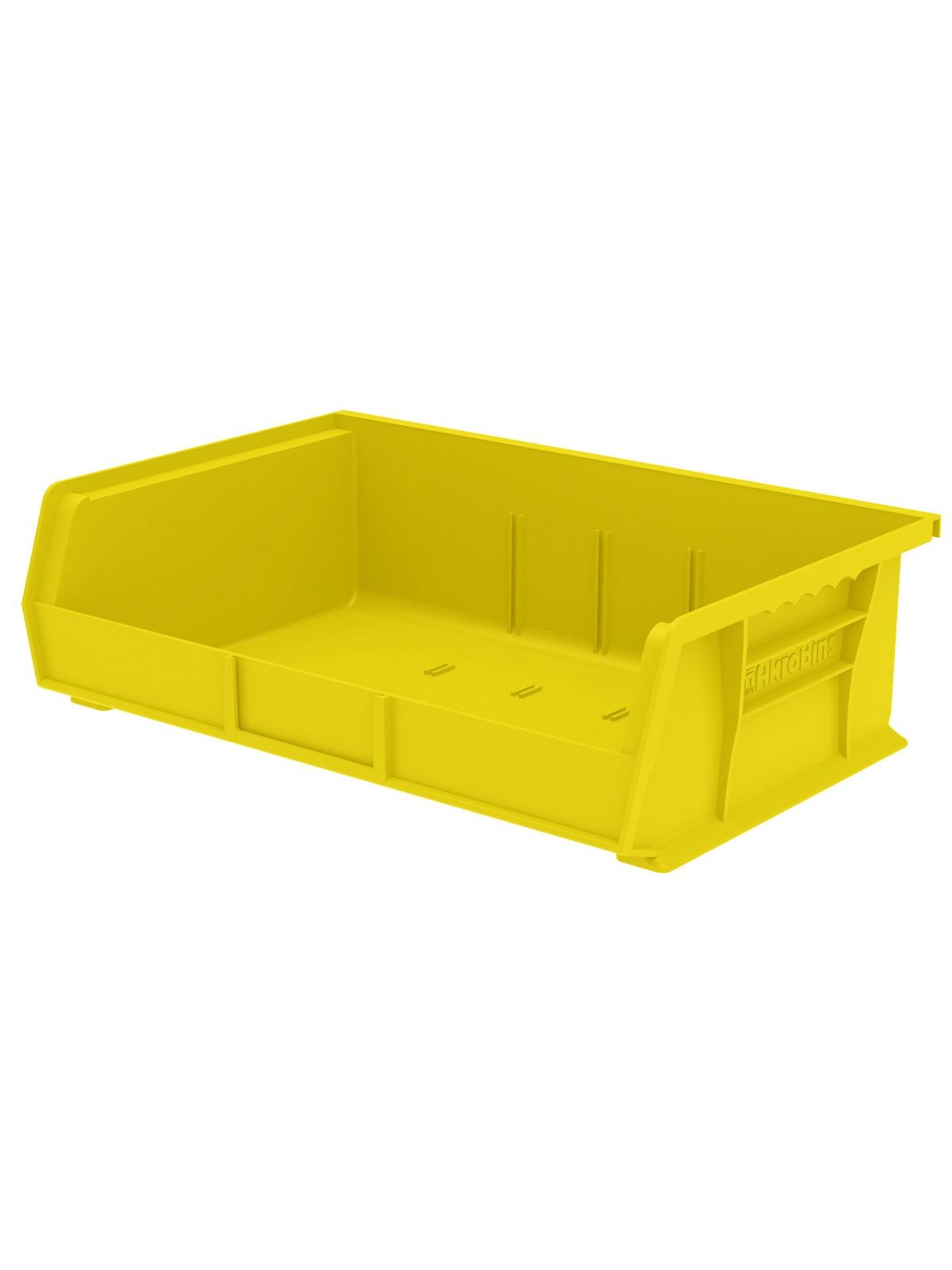AkroBins are heavy-duty and securely stack on top of each other, sit on shelving, and hang from Akro-Mils racks, panels, rails and carts. Unaffected by weak acids and alkalis the sturdy one piece construction is water, rust and corrosion-proof. Finger grip allows for easy handling. Large label slot for easy identification of contents. Autoclavable up to 250° F. Guaranteed not to crack or break under normal load conditions as stated in the 1-year limited warranty. Optional dividers and labels available, see Related Items tab. AkroBins available in Red, Yellow, Blue, Green, Black, Stone, and Semi-Clear. FOB Shipping Point.