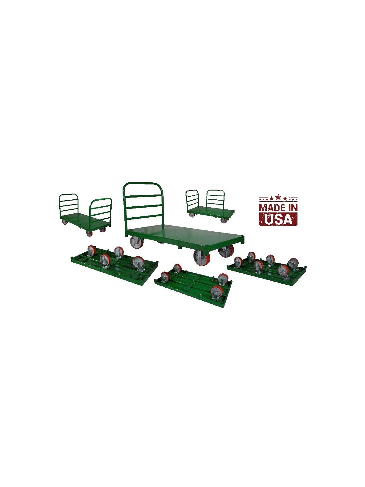 Heavy duty construction with 3 channel battens for added strength. 9 mounting plates offer a great range of flexibility in mounting casters. Choose from two different wheel types to fit all your needs. Platform truck furnished with one handle. For additional handles and other options check chart below. Additional pockets allow for a total of 4 handles or 8 pipe stakes. FOB Shipping Point. See Related Items tab for ALL-N-ONE Platform Truck Available Options.