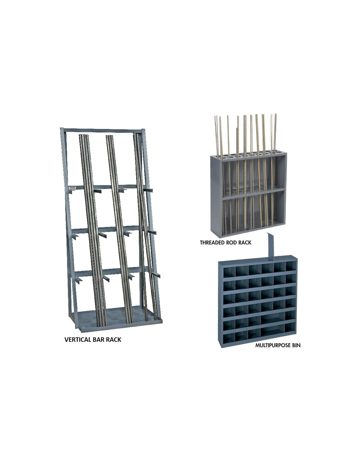Vertical Bar Rack All welded construction with 3000 lbs. capacity. Heavy duty angle iron frame and arms with 14 gauge steel shelves. Shelves are 5-1/4"D. x 36" W. Pan base is 24 x 36" and has a retaining lip to hold parts in place. Perfect for storing long parts like threaded rod, pipes or strut. Unit ships fully assembled ready for use and has a durable gray textured powder coat finish. Threaded Rod Rack Separates and protects threaded rods in 18 sections - each section 2-1/16" dia. Multipurpose Bin Removable vertical dividers allow the creation of double-width openings, each with scoops. Can be wall mounted.