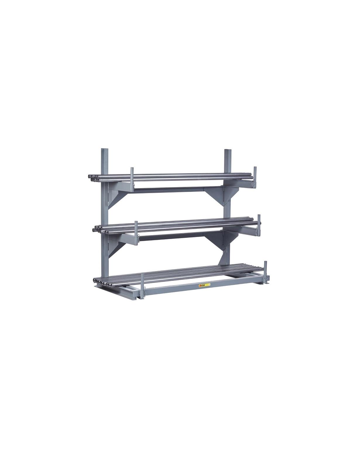 This single sided rack allows for efficient storage for bar stock, tubing, angles, and other long and bulky materials. The all-welded steel construction features structural channel frame, base and arms. Removable retainer pipes at ends of arms extend 5" high to provide secure load retention. Powder-coated finish. 1500 lbs. capacity per level, not to exceed 4000 lbs. overall. FOB Shipping Point.