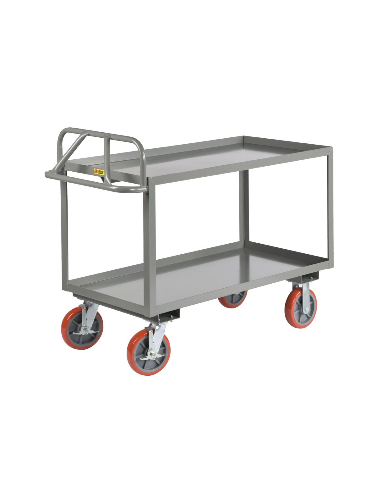 All welded construction with heavy 12 ga. shelves, these units ship fully assembled and ready for use. Non-marking polyurethane wheels (2 swivel, 2 rigid) provides the best combination of reduced rolling resistance and quiet operation. Wheel brakes on swivel casters standard. FOB Shipping Point.
