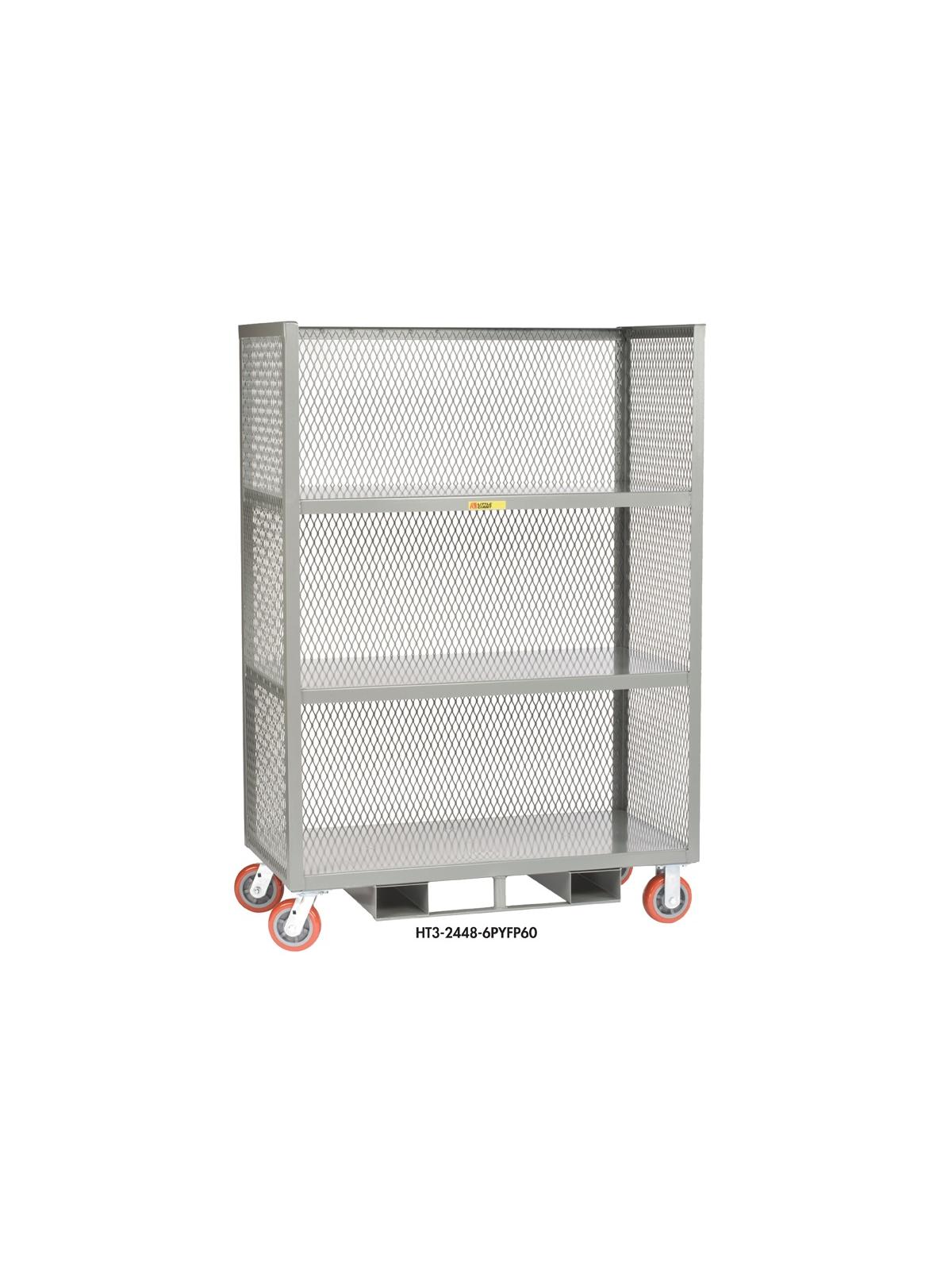 Large capacity, three shelf truck designed to securely attach to your order picker. Two full width fork pockets on 24" centers and 1-1/2" steel grab bar make attachment easy. Shelves have 19" clearance. Overall height is 69". 2 rigid and 2 swivel 6" polyurethane casters assure smooth rolling, even with a full load of 3,600 lbs. 48" length allows the unit to fit down any aisle. FOB Shipping Point.