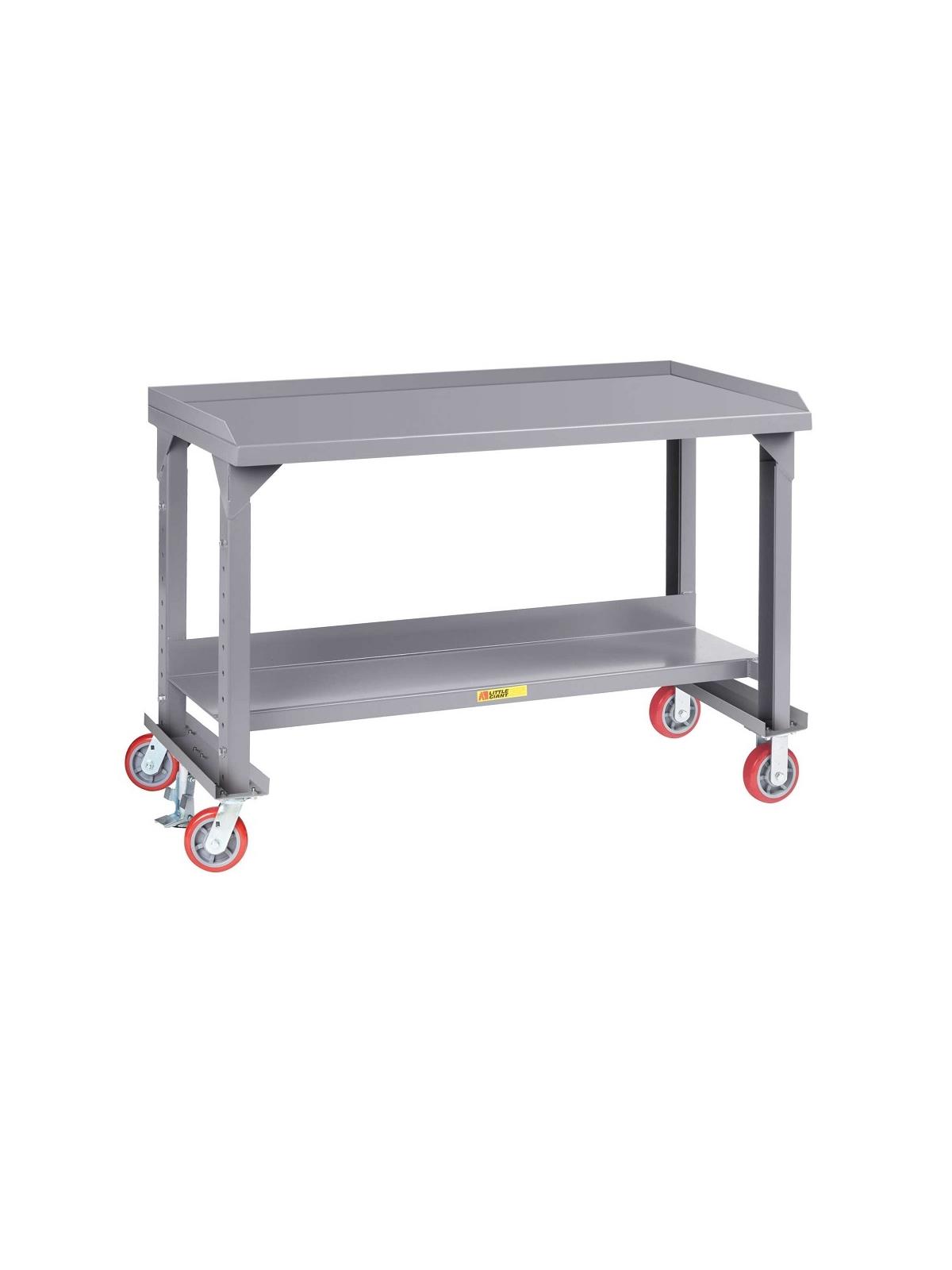 Features a double reinforced, 12 gauge steel top with 1-1/2" raised edge on back and sides. Two rigid and two swivel 6" polyurethane wheels. Floor lock stops unwanted movement. Choose from fixed or adjustable heights. FOB Shipping Point.