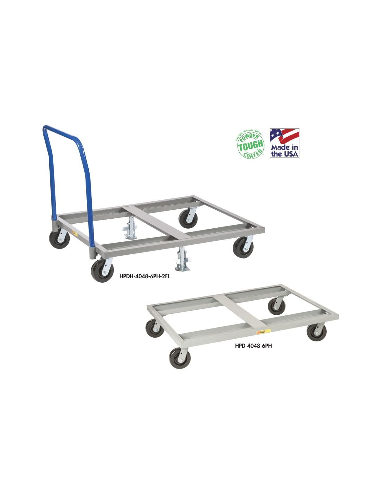 Has 4 swivel casters with non-marking 6" x 2" phenolic wheels and has a 3600-lbs. capacity. Welded steel construction for durability and strength. Ships set up and ready for immediate use. Double Floor Lock option prevents unwanted movement. Available with 36" wide removable pushbar handle. FOB Shipping Point. Surcharge may apply.