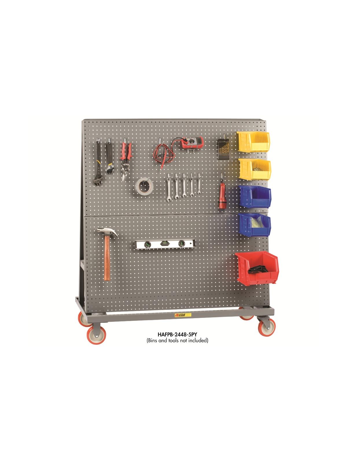 Double-sided 16 gauge pegboard. Pegboard extends 48" high above the base. Rolls on 5" polyurethane casters, 2 swivel and 2 rigid. All welded construction for long lasting durability. Durable powder coat finish. FOB Shipping Point. Surcharge may apply.