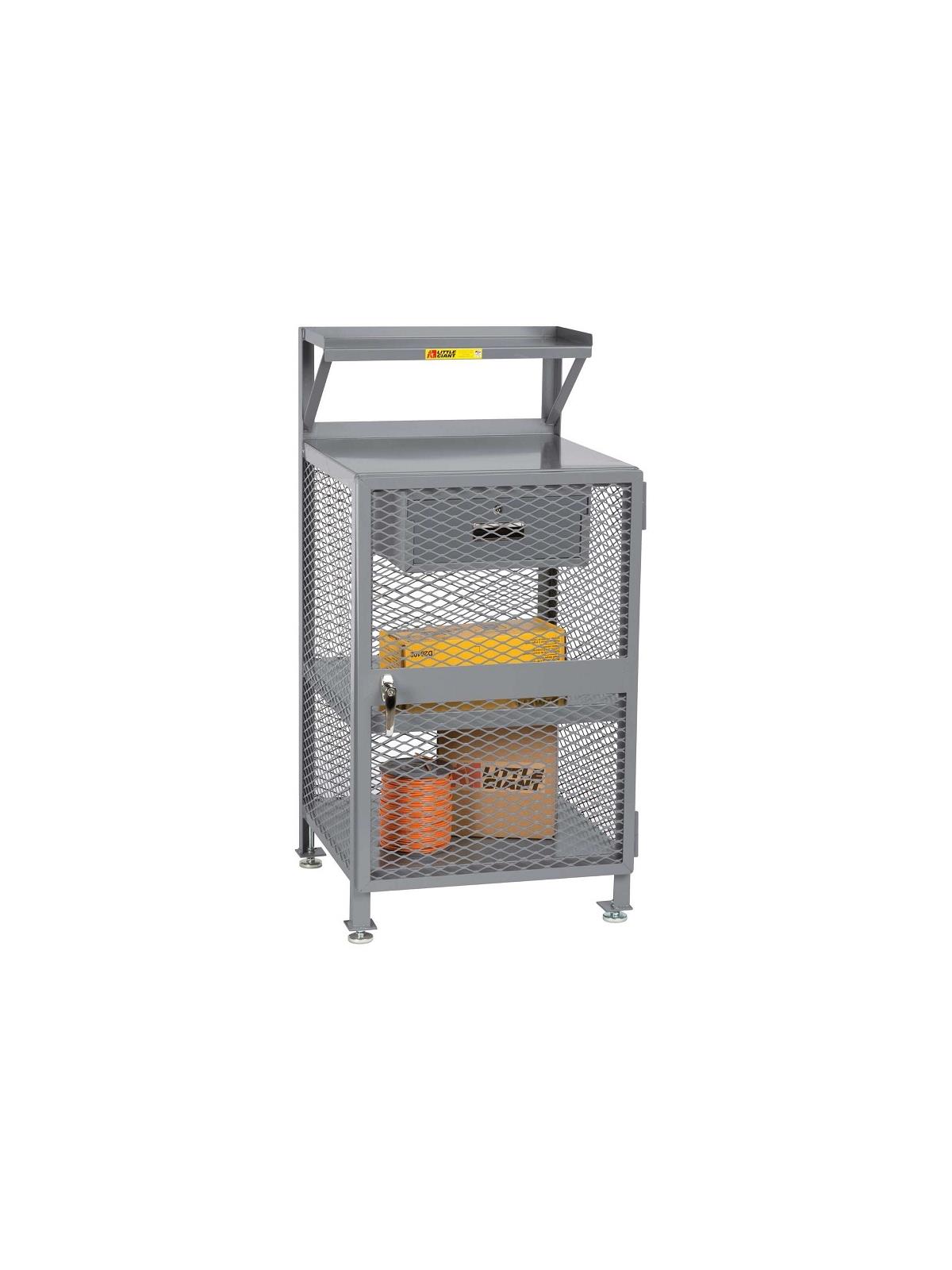 All-welded construction with comfortable height as a standing desk/workstation. Riser shelf is 10" deep and 10" above desk surface. Locking storage drawer is 13"W x 17"D x 4-1/2"H and comes with two keys. Lower shelves have 1-1/2" retaining lips and 11-3/4" shelf clearance. FOB Shipping Point.