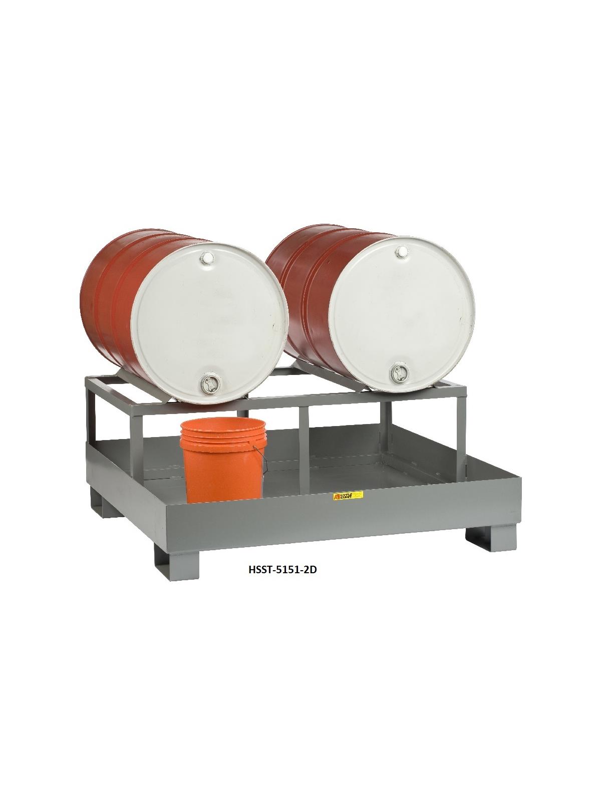 Heavy-gauge steel construction in a drum storage system that positions the drums ready for dispensing. 1-Drum unit has 33 gallon sump capacity and 2-Drum unit has 66 gallon sump capacity. Both include 4 way fork-liftable access. FOB Shipping Point.