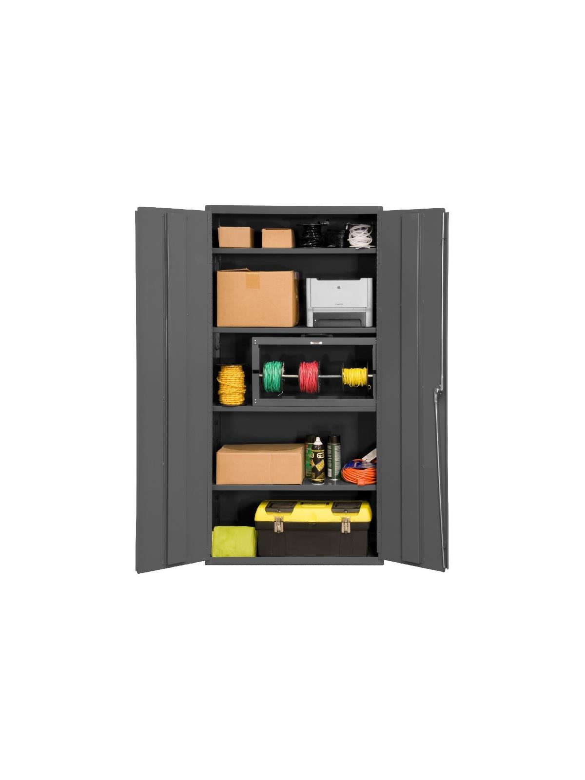Choose from ten models to store, sort and organize. Construction features not found anywhere else. Ideal for factories, warehouses or offices. Securely store tools, parts and supplies. Doors swing effortlessly. Doors also feature three point locking handle and two keys. Durable gray powder coat finish. FOB Shipping Point.