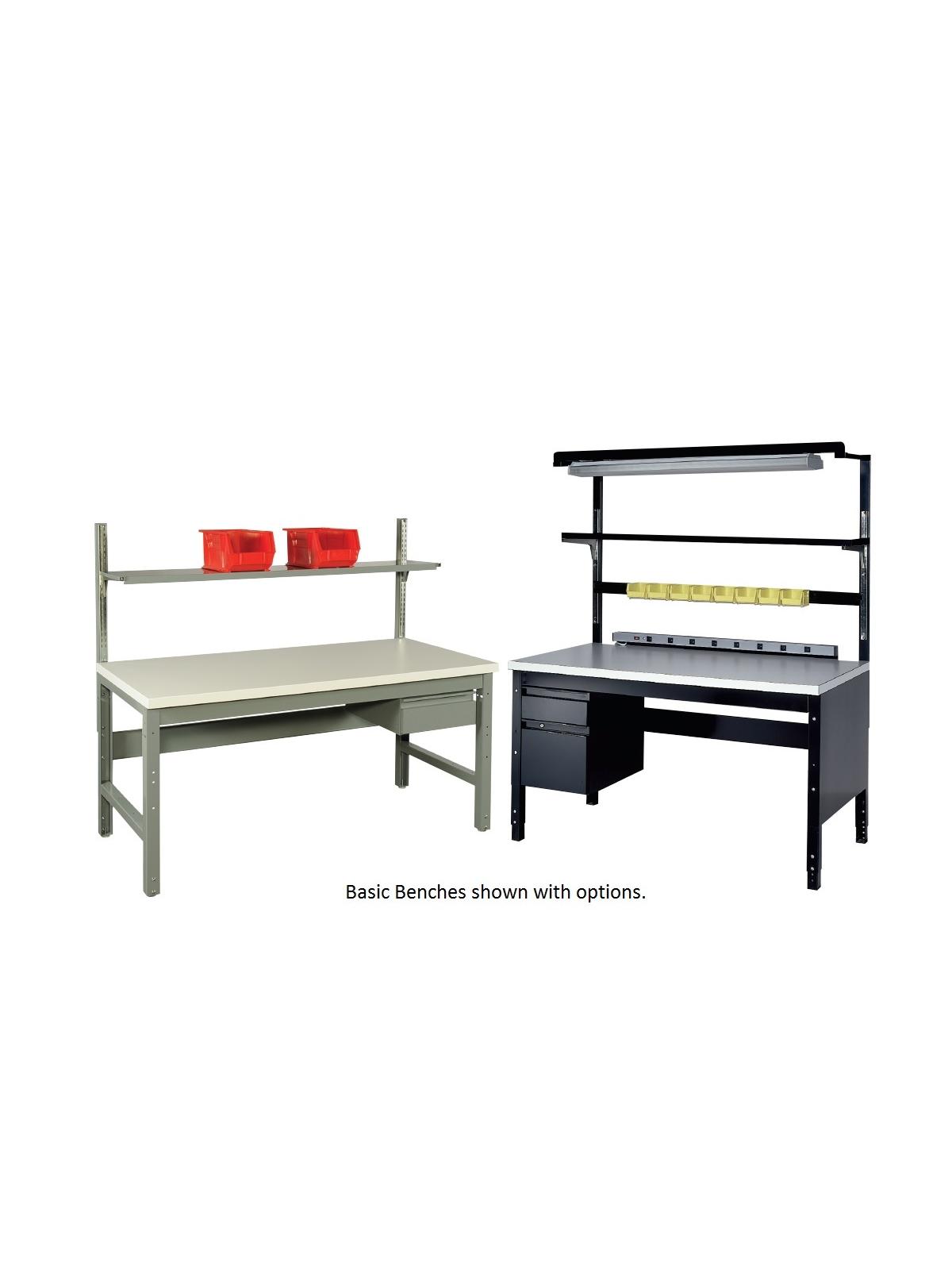 Designed and engineered for delicate electronic work, and built for long wearing use. Heavy duty all welded 14 ga. legs --­ adjustable from 31" to 35"H. --­ complete with leveling glides. 14 ga. apron front and rear eliminates top deflection. Top quality construction throughout. Assembles easily and quickly. Options available. FOB Shipping Point.