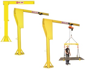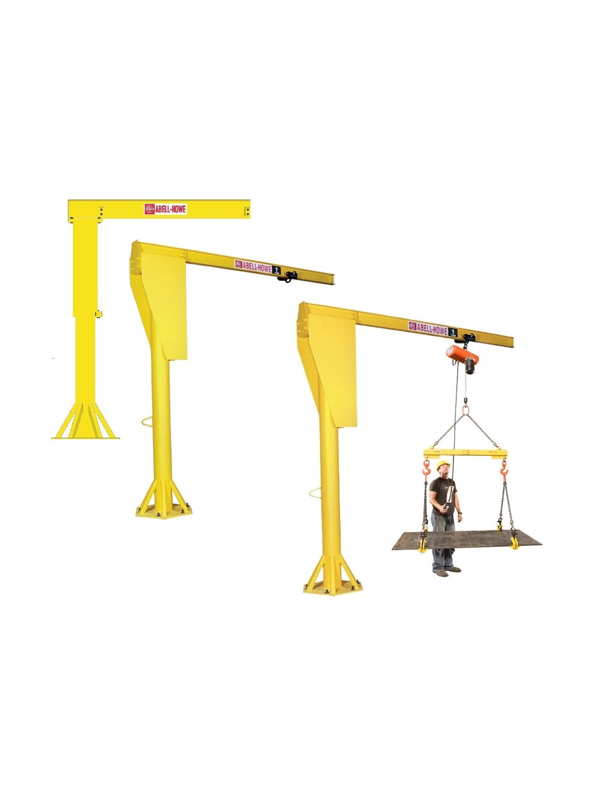 Heavy Duty Floor Cranes are ideal for manufacturing and assembly plants. Ruggedly constructed for industrial use. Heavy wall structural steel pipe mast and reinforced large diameter base plate for minimal deflection and continuous alignment. Rolled steel I-beam section with tapered flange for smooth trolley travel. Safety end stops at both ends of boom limit trolley travel High visibility Safety Yellow enamel finish. Cranes bolt to concrete foundations. Anchor bolts and paper or steel templates sold separately. Made in the USA. Available up to 5 Ton Capacity, 20 ft. Height Under Boom and 20 ft. Spans as standard - call for pricing if not listed. FOB Shipping Point.