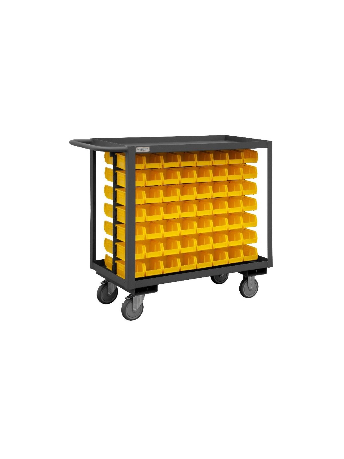 Carts feature 1-1/2" x 1/8" angle iron uprights for added strength. Shelves are heavy duty 14 gauge steel. Sturdy tubular push handle for ease of handling. Durable yellow Hook-On-Bins®. Top surface has 1-1/2" lips up. Louvered center panels accommodate Hook-On-Bins®. Rolls easily on 5" x 1-1/4" polyurethane bolt-on casters, (2) swivel with side brakes and (2) rigid. Ships fully assembled ready to use. Durable, gray, textured powder coat finish. FOB Shipping Point.
