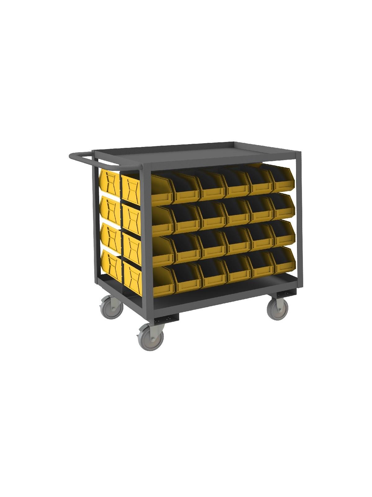 Carts feature 1-1/2" x 1/8" angle iron uprights for added strength. Shelves are heavy duty 14 gauge steel. Sturdy tubular push handle for ease of handling. Durable yellow Hook-On-Bins®. Top surface has 1-1/2" lips up. Louvered center panels accommodate Hook-On-Bins®. Rolls easily on 5" x 1-1/4" polyurethane bolt-on casters, (2) swivel with side brakes and (2) rigid. Ships fully assembled ready to use. Durable, gray, textured powder coat finish. FOB Shipping Point.