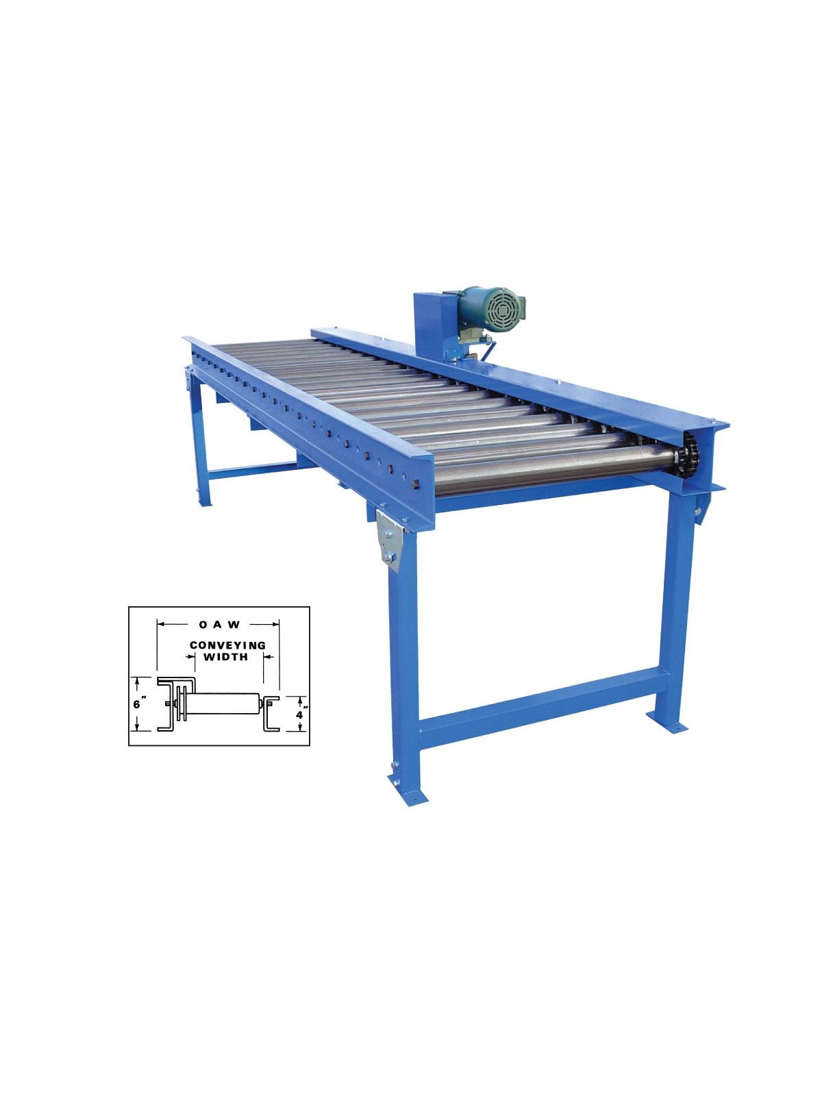 This progressive chain driven live roller conveyor is used for heavy duty applications such as pallet moving and drum handling. 3/4 HP 220/3/60 motor with 4" and 6" structural channel construction. 2-1/2" - 11 gauge rollers with 6" roller centers. No. 60 chain, roller-to-roller drive, 40 FPM. Adjustable supports included. 30" roller height. FOB Shipping Point. Surcharge may apply. Call us to order Roller Conveyors longer than 5'. See chart for max. length and cost per additional foot.